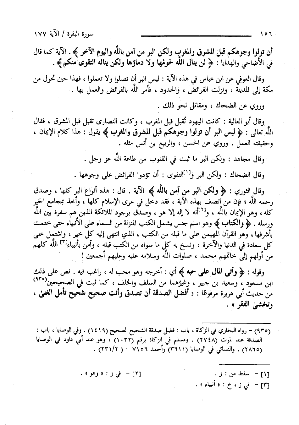 أَنْ تُوَلُّوا وُجُوهكُمْ قِبَل الْمَشْرِق وَالْمَغْرِب وَلَكِنَّ الْبِرّ مَنْ آمَنَ بِاَللَّهِ وَالْيَوْم الْآخِر " الْآيَة كَمَا قَالَ فِي الْأَضَاحِيّ وَالْهَدَايَا لَنْ يَنَال اللَّهَ لُحُومُهَا وَلَا دِمَاؤُهَا وَلَكِنْ يَنَالُهُ التَّقْوَى مِنْكُمْ " وَقَالَ الْعَوْفِيّ عَنْ اِبْن عَبَّاس فِي هَذِهِ الْآيَة لَيْسَ الْبِرّ أَنْ تُصَلُّوا وَلَا تَعْمَلُوا فَهَذَا حِين تَحَوَّلَ مِنْ مَكَّة إِلَى الْمَدِينَة وَنَزَلَتْ الْفَرَائِض وَالْحُدُود فَأَمَرَ اللَّه بِالْفَرَائِضِ وَالْعَمَل بِهَا وَرُوِيَ عَنْ الضَّحَّاك وَمُقَاتِل نَحْو ذَلِكَ وَقَالَ أَبُو الْعَالِيَة : كَانَتْ الْيَهُود تُقْبَل قِبَل الْمَغْرِب وَكَانَتْ النَّصَارَى تُقْبَل قِبَل الْمَشْرِق فَقَالَ اللَّه تَعَالَى " لَيْسَ الْبِرّ أَنْ تُوَلُّوا وُجُوهكُمْ قِبَل الْمَشْرِق وَالْمَغْرِب " يَقُول هَذَا كَلَام الْإِيمَان وَحَقِيقَته الْعَمَل وَرُوِيَ عَنْ الْحَسَن وَالرَّبِيع بْن أَنَس مِثْله .