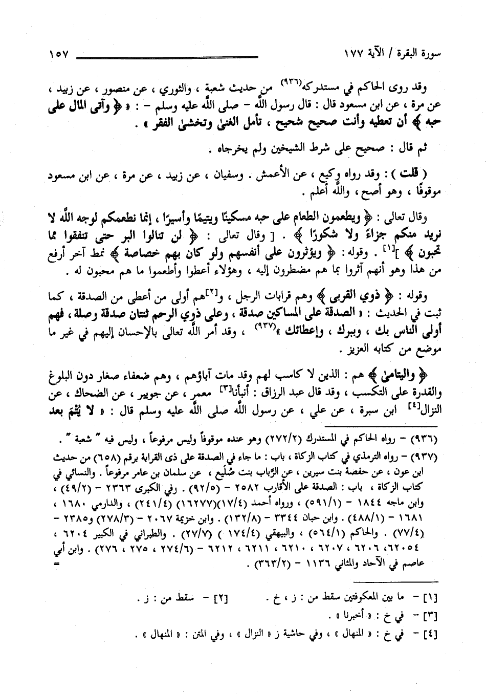 وَقَدْ رَوَى الْحَاكِم فِي مُسْتَدْرَكه مِنْ حَدِيث شُعْبَة وَالثَّوْرِيّ عَنْ مَنْصُور عَنْ زُبَيْد عَنْ مُرَّة عَنْ اِبْن مَسْعُود قَالَ : قَالَ رَسُول اللَّه صَلَّى اللَّه عَلَيْهِ وَسَلَّمَ " وَآتَى الْمَال عَلَى حُبّه أَنْ تُعْطِيه وَأَنْتَ صَحِيحٌ تَأْمَلُ الْعَيْش وَتَخْشَى الْفَقْر " ثُمَّ قَالَ صَحِيح عَلَى شَرْط الشَّيْخَيْنِ وَلَمْ يُخَرِّجَاهُ .