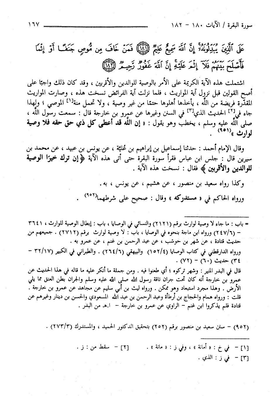 اِشْتَمَلَتْ هَذِهِ الْآيَة الْكَرِيمَة عَلَى الْأَمْر بِالْوَصِيَّةِ لِلْوَالِدَيْنِ وَالْأَقْرَبِينَ وَقَدْ كَانَ ذَلِكَ وَاجِبًا عَلَى أَصَحّ الْقَوْلَيْنِ قَبْل نُزُول آيَة الْمَوَارِيث فَلَمَّا نَزَلَتْ آيَة الْفَرَائِض نَسَخَتْ هَذِهِ وَصَارَتْ الْمَوَارِيث الْمُقَدَّرَة فَرِيضَة مِنْ اللَّه يَأْخُذهَا أَهْلُوهَا حَتْمًا مِنْ غَيْرِ وَصِيَّةٍ وَلَا تَحَمُّلٍ مِنْ الْمُوصِي وَلِهَذَا جَاءَ فِي الْحَدِيث الَّذِي فِي السُّنَن وَغَيْرهَا عَنْ عَمْرِو بْن خَارِجَة قَالَ : سَمِعْت رَسُول اللَّه صَلَّى اللَّه عَلَيْهِ وَسَلَّمَ يَخْطُب وَهُوَ يَقُول " إِنَّ اللَّه قَدْ أَعْطَى كُلّ ذِي حَقّ حَقّه فَلَا وَصِيَّة لِوَارِثٍ " وَقَالَ الْإِمَام أَحْمَد حَدَّثَنَا إِسْمَاعِيل بْن إِبْرَاهِيم بْن عُلَيَّة عَنْ يُونُس بْن عُبَيْد عَنْ مُحَمَّد بْن سِيرِينَ قَالَ : جَلَسَ اِبْن عَبَّاس فَقَرَأَ سُورَة الْبَقَرَة حَتَّى أَتَى هَذِهِ الْآيَة " إِنْ تَرَكَ خَيْرًا الْوَصِيَّةُ لِلْوَالِدَيْنِ وَالْأَقْرَبِينَ " فَقَالَ نُسِخَتْ هَذِهِ الْآيَة وَكَذَا رَوَاهُ سَعِيد بْن مَنْصُور عَنْ هُشَيْم عَنْ يُونُس بِهِ وَرَوَاهُ الْحَاكِم فِي مُسْتَدْرَكه وَقَالَ صَحِيح عَلَى شَرْطهمَا