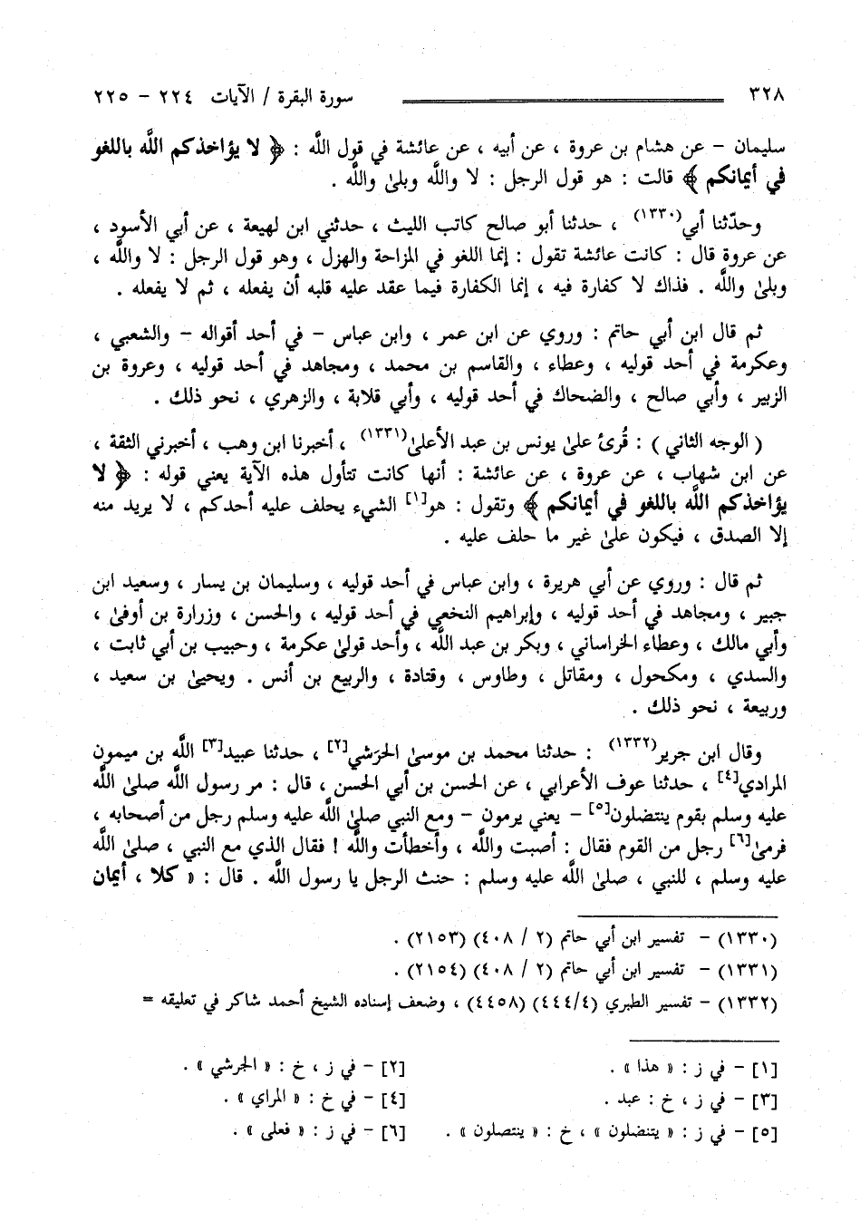 وَحَدَّثَنَا أَبِي حَدَّثَنَا أَبُو صَالِح كَاتِب اللَّيْث حَدَّثَنِي اِبْن لَهِيعَة عَنْ أَبِي الْأَسْوَد عَنْ عُرْوَة قَالَ : كَانَتْ عَائِشَة تَقُول إِنَّمَا اللَّغْو فِي الْمُزَاحَة وَالْهَزْل وَهُوَ قَوْل الرَّجُل لَا وَاَللَّه وَبَلَى وَاَللَّه فَذَاكَ لَا كَفَّارَة فِيهِ إِنَّمَا الْكَفَّارَة فِيمَا عَقَدَ عَلَيْهِ قَلْبه أَنْ يَفْعَلهُ ثُمَّ لَا يَفْعَلهُ ثُمَّ قَالَ اِبْن أَبِي حَاتِم وَرُوِيَ عَنْ اِبْن عُمَر وَابْن عَبَّاس فِي أَحَد قَوْلَيْهِ وَالشَّعْبِيّ وَعِكْرِمَة فِي أَحَد قَوْلَيْهِ وَعُرْوَة بْن الزُّبَيْر وَأَبِي صَالِح وَالضَّحَّاك فِي أَحَد قَوْلَيْهِ وَأَبِي قِلَابَة وَالزُّهْرِيّ نَحْو ذَلِكَ " الْوَجْه الثَّانِي " قُرِئَ عَلَى يُونُس بْن عَبْد الْأَعْلَى أَخْبَرَنَا اِبْن وَهْب أَخْبَرَنِي الثِّقَة عَنْ اِبْن شِهَاب عَنْ عُرْوَة عَنْ عَائِشَة أَنَّهَا كَانَتْ تَتَأَوَّل هَذِهِ الْآيَة يَعْنِي قَوْله " لَا يُؤَاخِذُكُمْ اللَّهُ بِاللَّغْوِ فِي أَيْمَانِكُمْ " وَتَقُول هُوَ الشَّيْء يَحْلِف عَلَيْهِ أَحَدكُمْ لَا يُرِيد مِنْهُ إِلَّا الصِّدْق فَيَكُون عَلَى غَيْر مَا حَلَفَ عَلَيْهِ ثُمَّ قَالَ : وَرُوِيَ عَنْ أَبِي هُرَيْرَة وَابْن عَبَّاس فِي أَحَد قَوْلَيْهِ وَسُلَيْمَان بْن يَسَار وَسَعِيد بْن جُبَيْر وَمُجَاهِد فِي أَحَد قَوْلَيْهِ وَإِبْرَاهِيم النَّخَعِيّ فِي أَحَد قَوْلَيْهِ وَالْحَسَن وَزُرَارَة بْن أَوْفَى وَأَبِي مَالِك وَعَطَاء الْخُرَاسَانِيّ وَبَكْر بْن عَبْد اللَّه أَحَد قَوْلَيْ عِكْرِمَة وَحَبِيب بْن أَبِي ثَابِت وَالسُّدِّيّ وَمَكْحُول وَمُقَاتِل وَطَاوُس وَقَتَادَة وَالرَّبِيع بْن أَنَس وَيَحْيَى بْن سَعِيد وَرَبِيعَة نَحْو ذَلِكَ وَقَالَ اِبْن جَرِير حَدَّثَنَا مُحَمَّد بْن مُوسَى الْجُرَشِيّ حَدَّثَنَا عَبْد اللَّه بْن مَيْمُون الْمُرَادِيّ حَدَّثَنَا عَوْف الْأَعْرَابِيّ عَنْ الْحَسَن بْن أَبِي الْحَسَن قَالَ مَرَّ رَسُول اللَّه - صَلَّى اللَّه عَلَيْهِ وَسَلَّمَ - بِقَوْمٍ يَنْتَضِلُونَ يَعْنِي يَرْمُونَ وَمَعَ رَسُول اللَّه - صَلَّى اللَّه عَلَيْهِ وَسَلَّمَ - رَجُل مِنْ أَصْحَابه فَقَامَ رَجُل مِنْ الْقَوْم فَقَالَ أَصَبْت وَاَللَّه وَأَخْطَأْت وَاَللَّه فَقَالَ الَّذِي مَعَ النَّبِيّ - صَلَّى اللَّه عَلَيْهِ وَسَلَّمَ - لِلنَّبِيِّ - صَلَّى اللَّه عَلَيْهِ وَسَلَّمَ - حَنِثَ الرَّجُل يَا رَسُول اللَّه قَالَ " كَلَّا أَيْمَان
