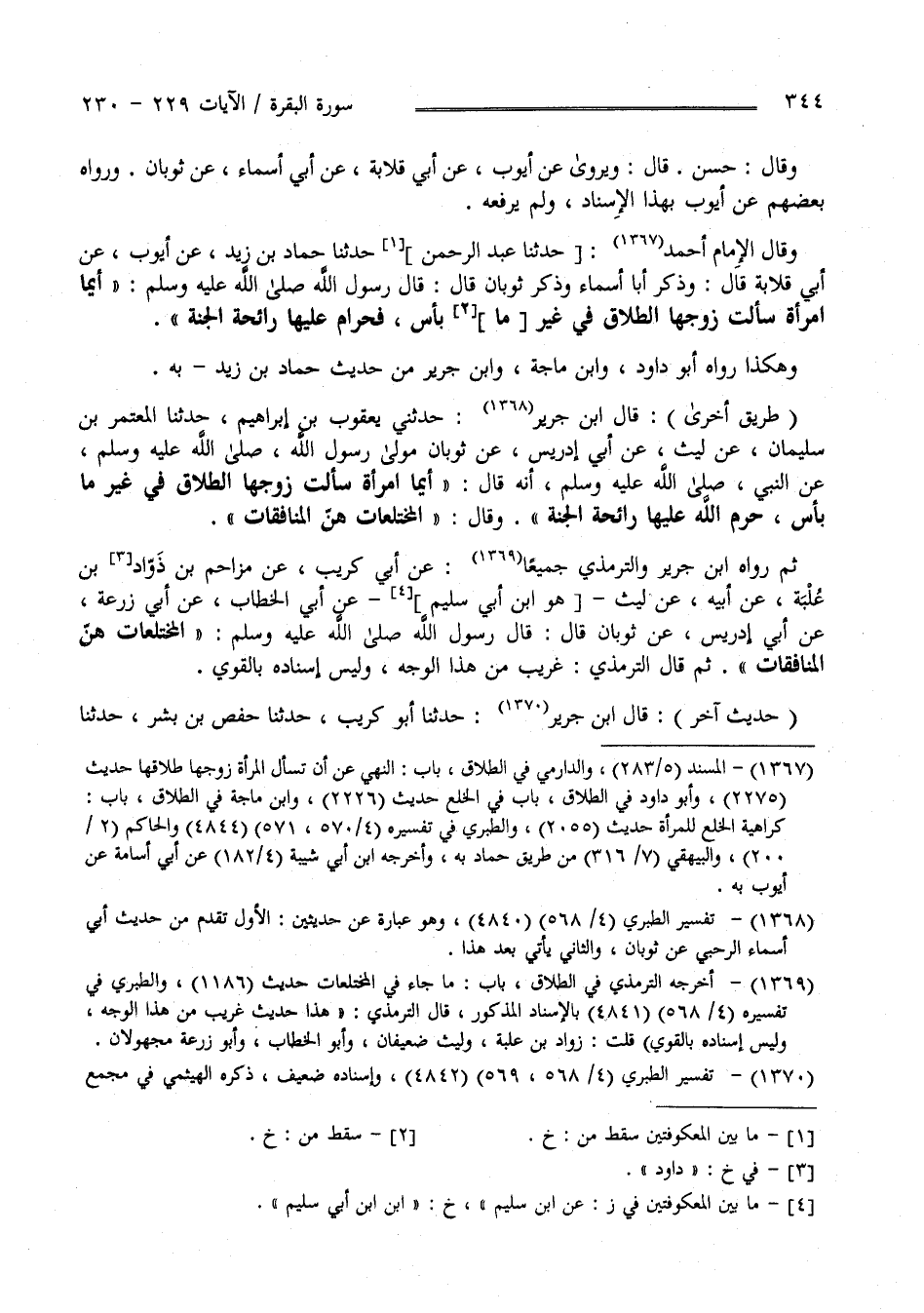 ثُمَّ رَوَاهُ اِبْن جَرِير وَالتِّرْمِذِيّ جَمِيعًا عَنْ أَبِي كُرَيْب عَنْ مُزَاحِم بْن دَاوُد بْن عُلَيَّة عَنْ أَبِيهِ عَنْ لَيْث هُوَ اِبْن أَبِي سُلَيْم عَنْ أَبِي الْخَطَّاب عَنْ أَبِي زُرْعَة عَنْ أَبِي إِدْرِيس عَنْ ثَوْبَان قَالَ : قَالَ رَسُول اللَّه - صَلَّى اللَّه عَلَيْهِ وَسَلَّمَ - " الْمُخْتَلِعَاتُ هُنَّ الْمُنَافِقَاتُ " ثُمَّ قَالَ التِّرْمِذِيّ : غَرِيب مِنْ هَذَا الْوَجْه وَلَيْسَ إِسْنَاده بِالْقَوِيِّ " حَدِيثٌ آخَرُ " قَالَ اِبْن جَرِير : حَدَّثَنَا أَيُّوب حَدَّثَنَا حَفْص بْن بِشْر