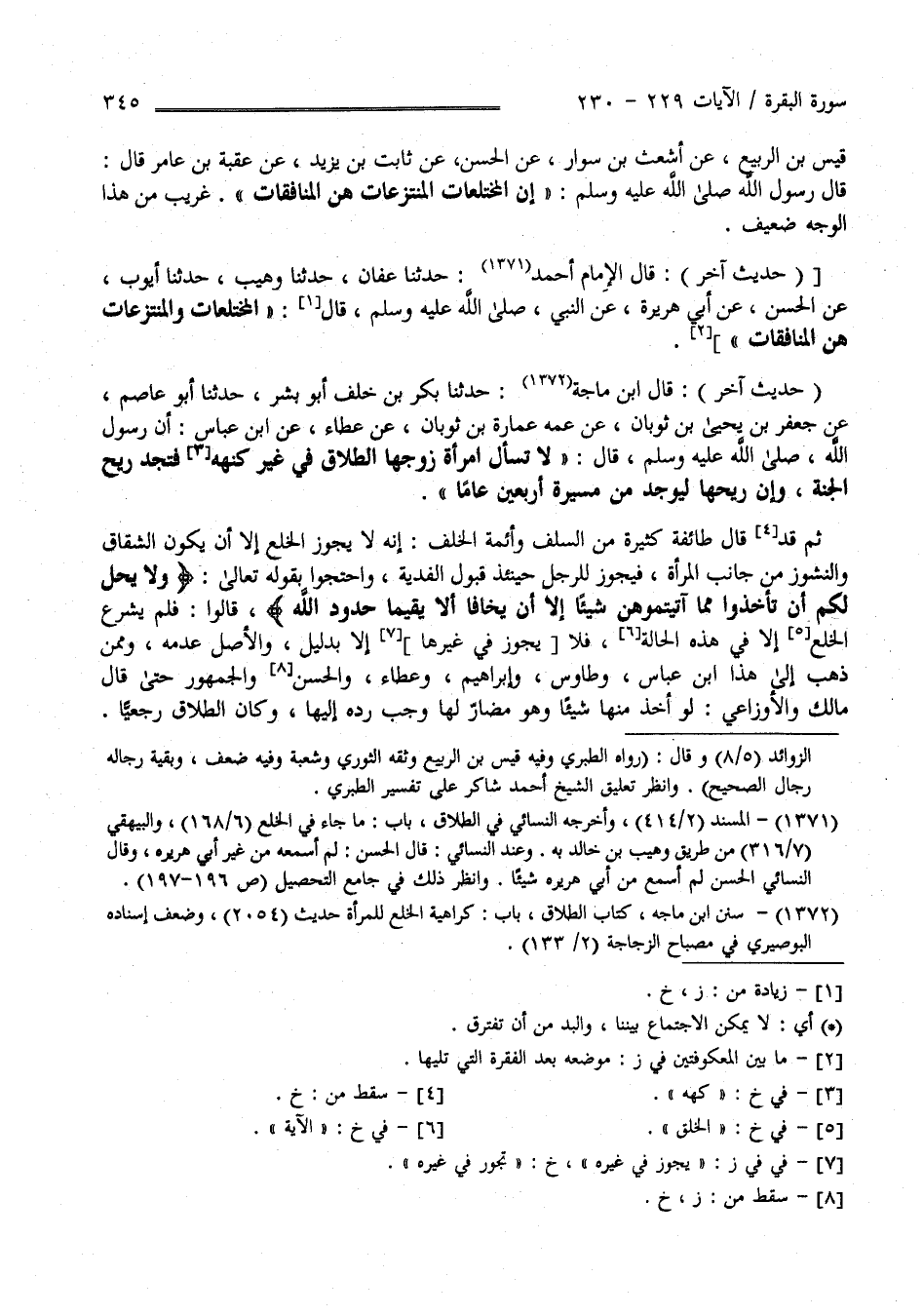 حَدَّثَنَا قَيْس بْن الرَّبِيع عَنْ أَشْعَث بْن سَوَّار عَنْ الْحَسَن عَنْ ثَابِت بْن يَزِيد عَنْ عُقْبَة بْن عَامِر قَالَ : قَالَ رَسُول اللَّه - صَلَّى اللَّه عَلَيْهِ وَسَلَّمَ - " إِنَّ الْمُخْتَلِعَات الْمُنْتَزِعَات هُنَّ الْمُنَافِقَات " غَرِيب مِنْ هَذَا الْوَجْه ضَعِيف " حَدِيثٌ آخَرُ " قَالَ الْإِمَام أَحْمَد : حَدَّثَنَا عَفَّان حَدَّثَنَا وُهَيْب حَدَّثَنَا أَيُّوب عَنْ الْحَسَن عَنْ أَبِي هُرَيْرَة عَنْ النَّبِيّ - صَلَّى اللَّه عَلَيْهِ وَسَلَّمَ - " الْمُتَخَلِّعَات وَالْمُنْتَزِعَات هُنَّ الْمُنَافِقَات " " حَدِيثٌ آخَرُ " قَالَ اِبْن مَاجَهْ : حَدَّثَنَا بَكْر بْن خَلَف أَبُو بِشْر حَدَّثَنَا أَبُو عَاصِم عَنْ جَعْفَر بْن يَحْيَى بْن ثَوْبَان عَنْ عَمّه عُمَارَة بْن ثَوْبَان عَنْ عَطَاء عَنْ اِبْن عَبَّاس أَنَّ رَسُول اللَّه - صَلَّى اللَّه عَلَيْهِ وَسَلَّمَ - قَالَ " لَا تَسْأَل اِمْرَأَةٌ زَوْجَهَا الطَّلَاقَ فِي غَيْر كُنْهه فَتَجِد رِيح الْجَنَّة وَإِنَّ رِيحهَا لَيُوجَد مِنْ مَسِيرَة أَرْبَعِينَ عَامًا " .