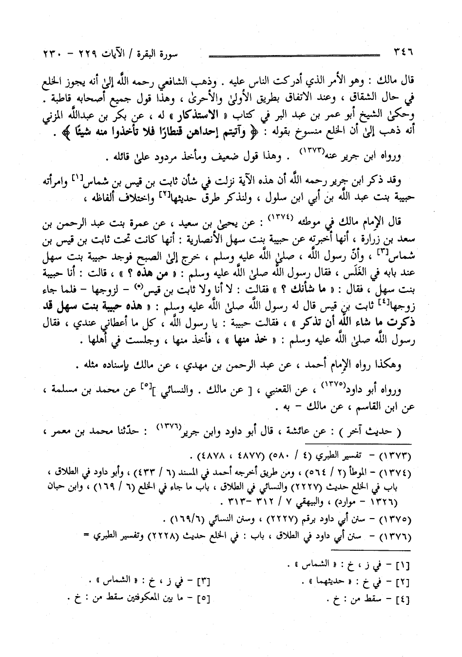 وَرَوَاهُ اِبْن جَرِير عَنْهُ وَهَذَا قَوْل ضَعِيف وَمَأْخَذٌ مَرْدُودٌ عَلَى قَائِله وَقَدْ ذَكَرَ اِبْن جَرِير رَحِمَهُ اللَّه أَنَّ هَذِهِ الْآيَة نَزَلَتْ فِي شَأْن ثَابِت بْن قَيْس بْن شَمَّاس وَامْرَأَته حَبِيبَة بِنْت عَبْد اللَّه بْن أُبَيّ بْن سَلُول وَلْنَذْكُرْ طُرُق حَدِيثهَا وَاخْتِلَاف أَلْفَاظه : قَالَ الْإِمَام مَالِك فِي مُوَطَّئِهِ عَنْ يَحْيَى بْن سَعِيد عَنْ عَمْرَة بِنْت عَبْد الرَّحْمَن بْن سَعِيد بْن زُرَارَة أَنَّهَا أَخْبَرَتْهُ عَنْ حَبِيبَة بِنْت سَهْل الْأَنْصَارِيّ أَنَّهَا كَانَتْ تَحْت ثَابِت بْن قَيْس بْن شَمَّاس وَأَنَّ رَسُول اللَّه - صَلَّى اللَّه عَلَيْهِ وَآلِهِ وَسَلَّمَ - خَرَجَ إِلَى الصُّبْح فَوَجَدَ حَبِيبَة بِنْت سَهْل عِنْد بَابه فِي الْغَلَس فَقَالَ رَسُول اللَّه - صَلَّى اللَّه عَلَيْهِ وَآلِهِ وَسَلَّمَ - " مَنْ هَذِهِ ؟ " قُلْت : أَنَا حَبِيبَة بِنْت سَهْل فَقَالَ " مَا شَأْنك " فَقَالَتْ : لَا أَنَا وَلَا ثَابِت بْن قَيْس لِزَوْجِهَا فَلَمَّا جَاءَ زَوْجهَا ثَابِت بْن قَيْس قَالَ لَهُ رَسُول اللَّه - صَلَّى اللَّه عَلَيْهِ وَسَلَّمَ - " هَذِهِ حَبِيبَة بِنْت سَهْل قَدْ ذَكَرَتْ مَا شَاءَ اللَّه أَنْ تَذْكُر " فَقَالَتْ حَبِيبَة : يَا رَسُول اللَّه كُلّ مَا أَعْطَانِي عِنْدِي فَقَالَ رَسُول اللَّه - صَلَّى اللَّه عَلَيْهِ وَسَلَّمَ - " خُذْ مِنْهَا " فَأَخَذَ مِنْهَا وَجَلَسَتْ فِي أَهْلهَا .