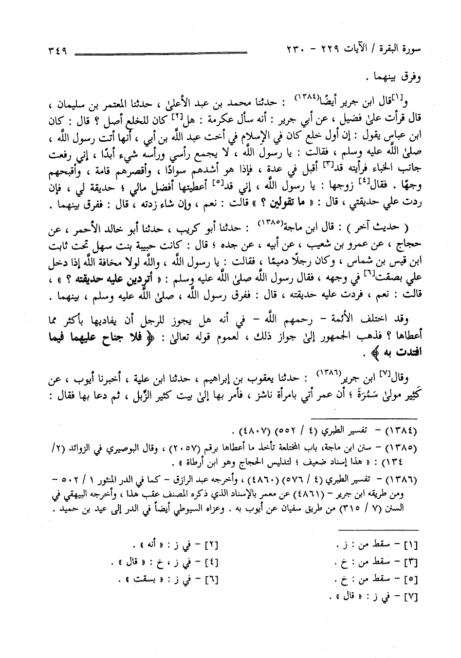 وَقَالَ اِبْن جَرِير أَيْضًا حَدَّثَنَا مُحَمَّد بْن عَبْد الْأَعْلَى حَدَّثَنَا الْمُعْتَمِر بْن سُلَيْمَان قَالَ قَرَأْت عَلَى فُضَيْل عَنْ أَبِي جَرِير أَنَّهُ سَأَلَ عِكْرِمَة هَلْ كَانَ لِلْخُلْعِ أَصْل ؟ قَالَ : كَانَ اِبْن عَبَّاس يَقُول إِنَّ أَوَّل خُلْع كَانَ فِي الْإِسْلَام فِي أُخْت عَبْد اللَّه بْن أُبَيّ أَنَّهَا أَتَتْ رَسُول اللَّه - صَلَّى اللَّه عَلَيْهِ وَسَلَّمَ - فَقَالَتْ يَا رَسُول اللَّه لَا يَجْمَع رَأْسِي وَرَأْسه شَيْء أَبَدًا إِنِّي رَفَعْت جَانِب الْخِبَاء فَرَأَيْته قَدْ أَقْبَلَ فِي عِدَّة فَإِذَا هُوَ أَشَدّهمْ سَوَادًا وَأَقْصَرهمْ قَامَة وَأَقْبَحهمْ وَجْهًا فَقَالَ زَوْجهَا يَا رَسُول اللَّه إِنِّي قَدْ أَعْطَيْتهَا أَفْضَل مَالِي حَدِيقَة لِي فَإِنْ رَدَّتْ عَلَيَّ حَدِيقَتِي قَالَ" مَا تَقُولِينَ " ؟ قَالَتْ : نَعَمْ وَإِنْ شَاءَ زِدْته .