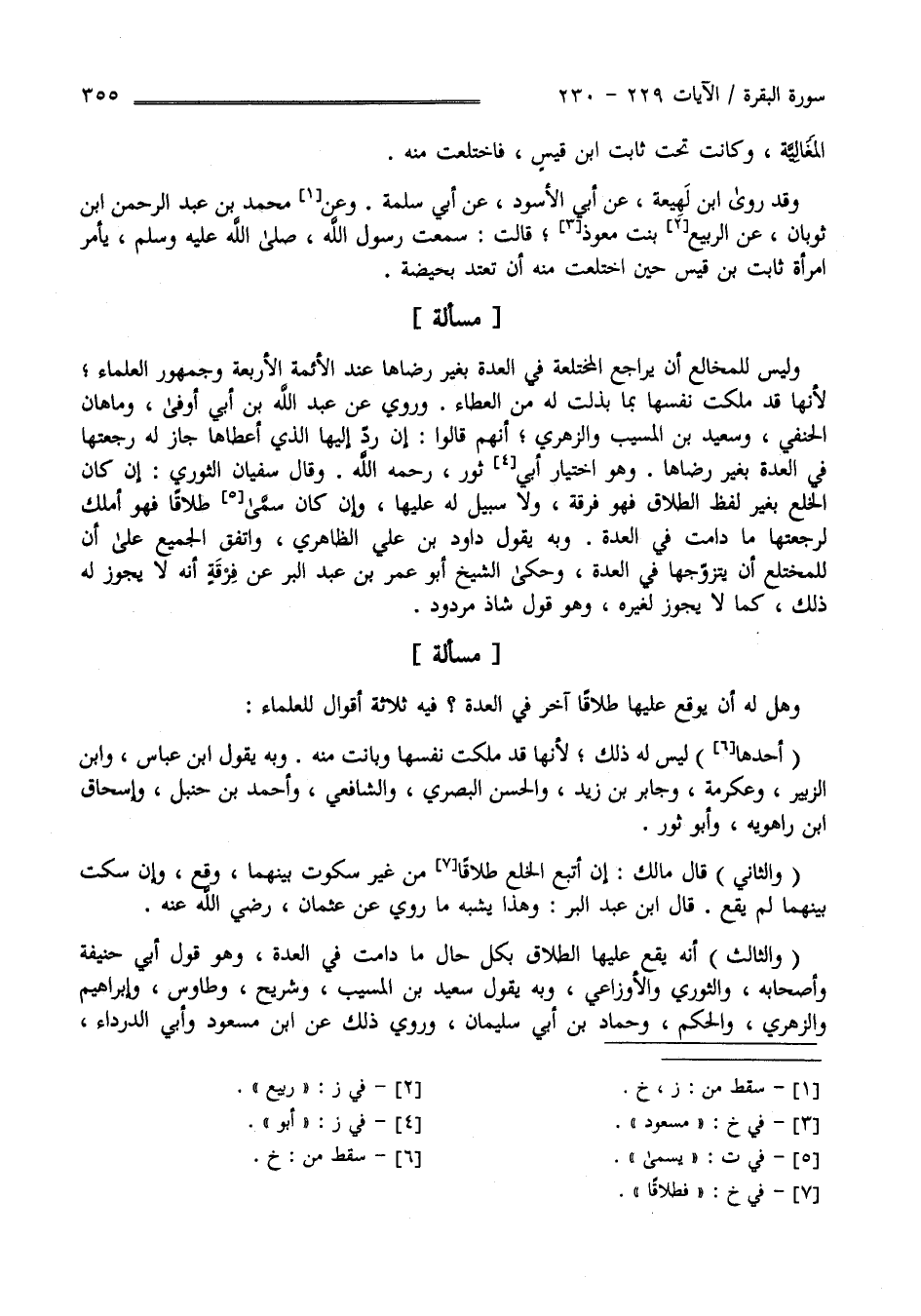 " مَسْأَلَةٌ " وَلَيْسَ لِلْمُخَالَعِ أَنْ يُرَاجِع الْمُخْتَلِعَة فِي الْعِدَّة بِغَيْرِ رِضَاهَا عِنْد الْأَئِمَّة الْأَرْبَعَة وَجُمْهُور الْعُلَمَاء لِأَنَّهَا قَدْ مَلَكَتْ نَفْسهَا بِمَا بَذَلَتْ لَهُ مِنْ الْعَطَاء .