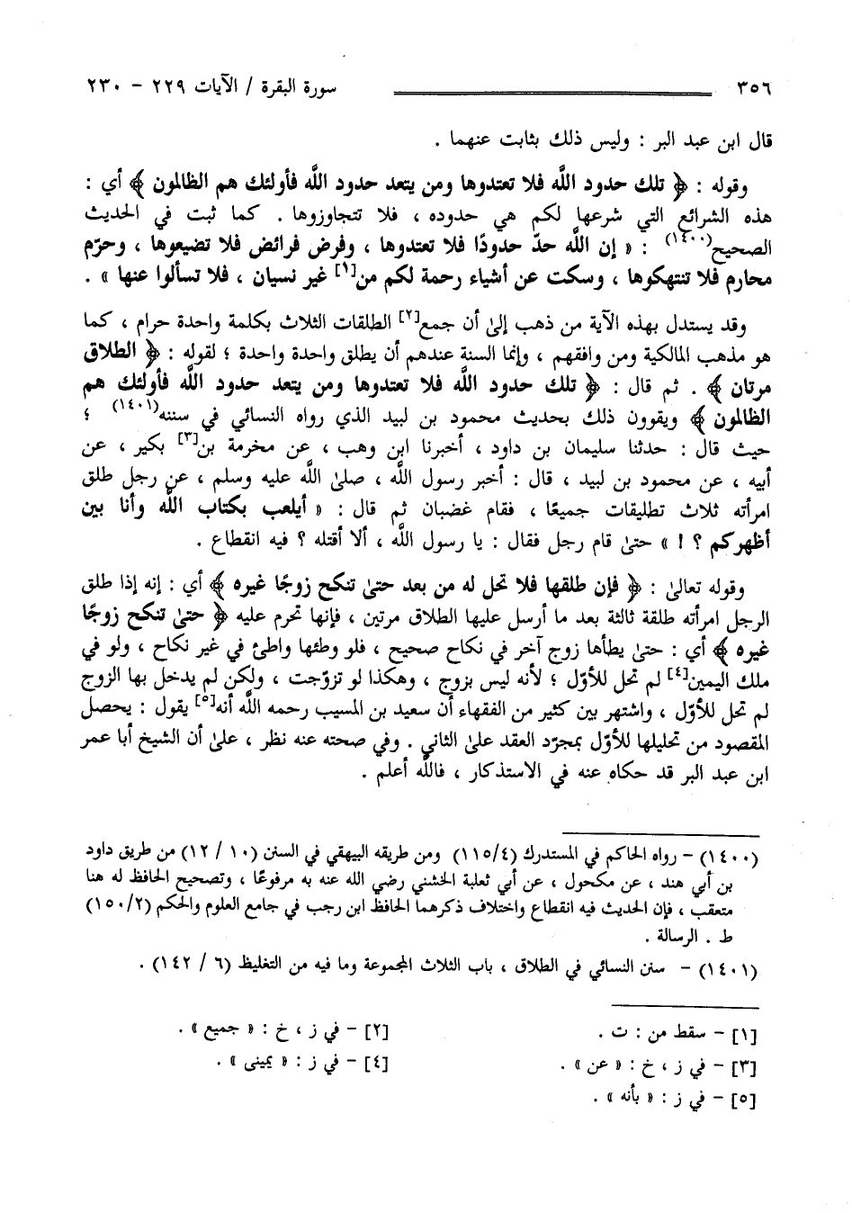 وَقَوْله " تِلْكَ حُدُود اللَّه فَلَا تَعْتَدُوهَا وَمَنْ يَتَعَدَّ حُدُودَ اللَّهِ فَأُولَئِكَ هُمْ الظَّالِمُونَ " أَيْ هَذِهِ الشَّرَائِع الَّتِي شَرَعَهَا لَكُمْ هِيَ حُدُوده فَلَا تَتَجَاوَزُوهَا كَمَا ثَبَتَ فِي الْحَدِيث الصَّحِيح" إِنَّ اللَّه حَدَّ حُدُودًا فَلَا تَعْتَدُوهَا وَفَرَضَ فَرَائِض فَلَا تُضَيِّعُوهَا وَحَرَّمَ مَحَارِم فَلَا تَنْتَهِكُوهَا وَسَكَتَ عَنْ أَشْيَاء رَحْمَة لَكُمْ غَيْر نِسْيَان فَلَا تَسْأَلُوا عَنْهَا" وَقَدْ يَسْتَدِلّ بِهَذِهِ الْآيَة مَنْ ذَهَبَ إِلَى أَنَّ جَمْع الطَّلَقَات الثَّلَاث بِكَلِمَةٍ وَاحِدَة حَرَام كَمَا هُوَ مَذْهَب الْمَالِكِيَّة وَمَنْ وَافَقَهُمْ وَإِنَّمَا السُّنَّة عِنْدهمْ أَنْ يُطَلِّق وَاحِدَة لِقَوْلِهِ " الطَّلَاق مَرَّتَانِ " ثُمَّ قَالَ" تِلْكَ حُدُود اللَّه فَلَا تَعْتَدُوهَا وَمَنْ يَتَعَدَّ حُدُود اللَّه فَأُولَئِكَ هُمْ الظَّالِمُونَ " وَيُقَوُّونَ ذَلِكَ بِحَدِيثِ مَحْمُود بْن لَبِيد الَّذِي رَوَاهُ النَّسَائِيّ فِي سُنَنه حَيْثُ قَالَ : حَدَّثَنَا سُلَيْمَان بْن دَاوُد أَخْبَرَنَا اِبْن وَهْب عَنْ مَخْرَمَة بْن بُكَيْر عَنْ أَبِيهِ عَنْ مَحْمُود بْن لَبِيد قَالَ : أُخْبِرَ رَسُول اللَّه - صَلَّى اللَّه عَلَيْهِ وَآلِهِ وَسَلَّمَ - عَنْ رَجُل طَلَّقَ اِمْرَأَته ثَلَاث تَطْلِيقَات جَمِيعًا فَقَامَ غَضْبَان ثُمَّ قَالَ : " أَيُلْعَبُ بِكِتَابِ اللَّه وَأَنَا بَيْن أَظْهُرِكُمْ " حَتَّى قَامَ رَجُل فَقَالَ يَا رَسُول اللَّه أَلَا أَقْتُلهُ ؟ فِيهِ اِنْقِطَاعٌ .