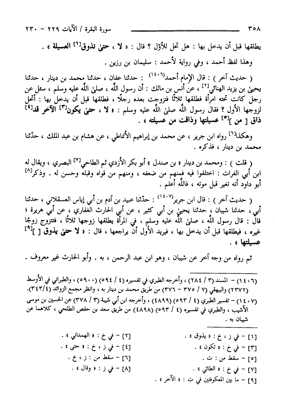 يُطَلِّقهَا قَبْل أَنْ يَدْخُل بِهَا هَلْ تَحِلّ لِلْأَوَّلِ ؟ قَالَ : " لَا حَتَّى تَذُوق الْعُسَيْلَة " وَهَذَا لَفْظ أَحْمَد وَفِي رِوَايَة لِأَحْمَد سُلَيْمَان بْن رَزِين " حَدِيثٌ آخَرُ " قَالَ الْإِمَام أَحْمَد : حَدَّثَنَا عَفَّان حَدَّثَنَا مُحَمَّد بْن دِينَار حَدَّثَنَا يَحْيَى بْن يَزِيد الْهُنَائِيّ عَنْ أَنَس بْن مَالِك أَنَّ رَسُول اللَّه - صَلَّى اللَّه عَلَيْهِ وَسَلَّمَ - سُئِلَ عَنْ رَجُل كَانَتْ تَحْته اِمْرَأَة فَطَلَّقَهَا ثَلَاثًا فَتَزَوَّجَتْ بَعْده رَجُلًا فَطَلَّقَهَا قَبْل أَنْ يَدْخُل بِهَا أَتَحِلُّ لِزَوْجِهَا الْأَوَّل ؟ فَقَالَ رَسُول اللَّه - صَلَّى اللَّه عَلَيْهِ وَسَلَّمَ - " لَا حَتَّى يَكُون الْآخَر قَدْ ذَاقَ مِنْ عُسَيْلَتهَا وَذَاقَتْ مِنْ عُسَيْلَته " .