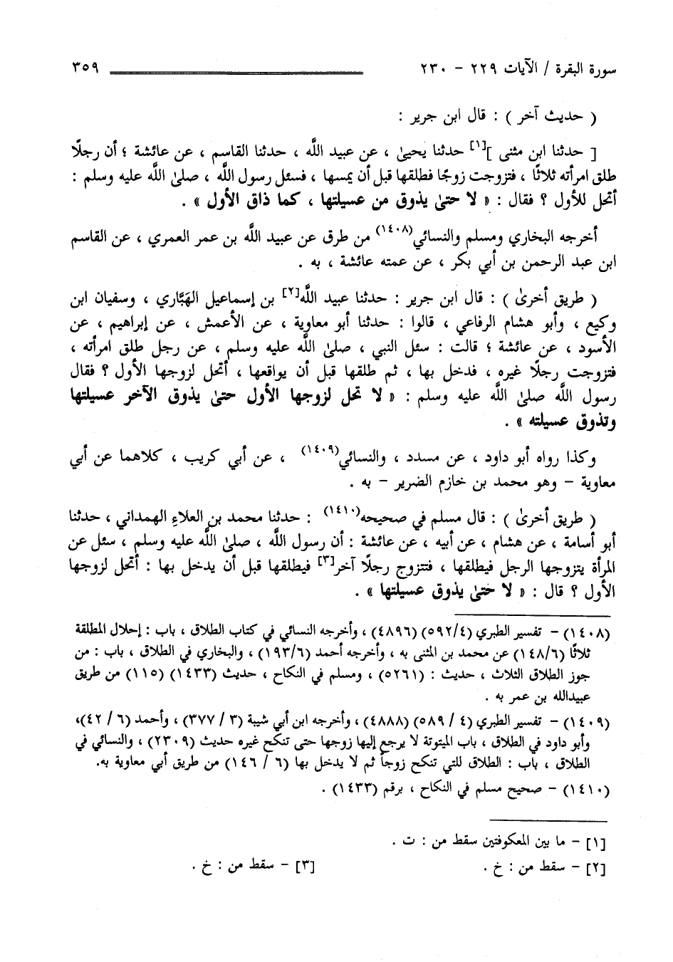 " حَدِيثٌ آخَرُ " قَالَ اِبْن جَرِير : حَدَّثَنَا يَحْيَى عَنْ عُبَيْد اللَّه حَدَّثَنَا الْقَاسِم عَنْ عَائِشَة أَنَّ رَجُلًا طَلَّقَ اِمْرَأَته ثَلَاثًا فَتَزَوَّجَتْ زَوْجًا فَطَلَّقَهَا قَبْل أَنْ يَمَسّهَا فَسُئِلَ رَسُول اللَّه - صَلَّى اللَّه عَلَيْهِ وَسَلَّمَ - أَتَحِلُّ لِلْأَوَّلِ ؟ فَقَالَ " لَا حَتَّى يَذُوق مِنْ عُسَيْلَتهَا كَمَا ذَاقَ الْأَوَّل" أَخْرَجَهُ الْبُخَارَيْ وَمُسْلِم وَالنَّسَائِيّ مِنْ طُرُق عَنْ عُبَيْد اللَّه بْن عُمَر الْعُمَرِيّ عَنْ الْقَاسِم بْن أَبِي بُكَيْر عَنْ عَمَّته عَائِشَة بِهِ " طَرِيقٌ أُخْرَى " قَالَ اِبْن جَرِير : حَدَّثَنَا عُبَيْد اللَّه بْن إِسْمَاعِيل الْهَبَّارِيّ وَسُفْيَان بْن وَكِيع وَأَبُو هِشَام الرِّفَاعِيّ قَالُوا : حَدَّثَنَا أَبُو مُعَاوِيَة عَنْ الْأَعْمَش عَنْ إِبْرَاهِيم عَنْ الْأَسْوَد عَنْ عَائِشَة قَالَتْ : سُئِلَ النَّبِيّ - صَلَّى اللَّه عَلَيْهِ وَسَلَّمَ - عَنْ رَجُل طَلَّقَ اِمْرَأَته فَتَزَوَّجَتْ رَجُلًا غَيْره فَدَخَلَ بِهَا ثُمَّ طَلَّقَهَا قَبْل أَنْ يُوَاقِعهَا أَتَحِلُّ لِزَوْجِهَا الْأَوَّل ؟ فَقَالَ رَسُول اللَّه صَلَّى اللَّه عَلَيْهِ وَسَلَّمَ : " لَا تَحِلّ لِزَوْجِهَا الْأَوَّل حَتَّى يَذُوق الْآخَرُ عُسَيْلَتَهَا وَتَذُوقَ عُسَيْلَتَهُ " .