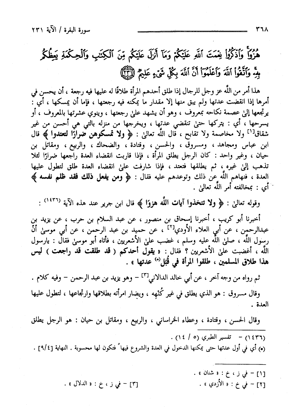 وَقَوْله تَعَالَى " وَلَا تَتَّخِذُوا آيَات اللَّه هُزُوًا " قَالَ اِبْن جَرِير : عِنْد هَذِهِ الْآيَة أَخْبَرَنَا أَبُو كُرَيْب أَخْبَرَنَا إِسْحَاق بِنَّ مَنْصُور عَنْ عَبْد السَّلَام بْن حَرْب عَنْ يَزِيد بْن عَبْد الرَّحْمَن عَنْ أَبِي الْعَلَاء الْأَزْدِيّ عَنْ حُمَيْد بْن عَبْد الرَّحْمَن عَنْ أَبِي مُوسَى أَنَّ رَسُول اللَّه - صَلَّى اللَّه عَلَيْهِ وَسَلَّمَ - غَضِبَ عَلَى الْأَشْعَرِيِّينَ فَأَتَاهُ أَبُو مُوسَى فَقَالَ يَا رَسُول اللَّه أَغَضِبْت عَلَى الْأَشْعَرِيِّينَ ؟ فَقَالَ " يَقُول أَحَدكُمْ قَدْ طَلَّقْت قَدْ رَاجَعْت لَيْسَ هَذَا طَلَاق الْمُسْلِمِينَ طَلِّقُوا الْمَرْأَة فِي قُبُل عِدَّتهَا " ثُمَّ رَوَاهُ مِنْ وَجْه آخَر عَنْ أَبِي خَالِد الدَّلَّال وَهُوَ يَزِيد بْن عَبْد الرَّحْمَن وَفِيهِ كَلَامٌ .