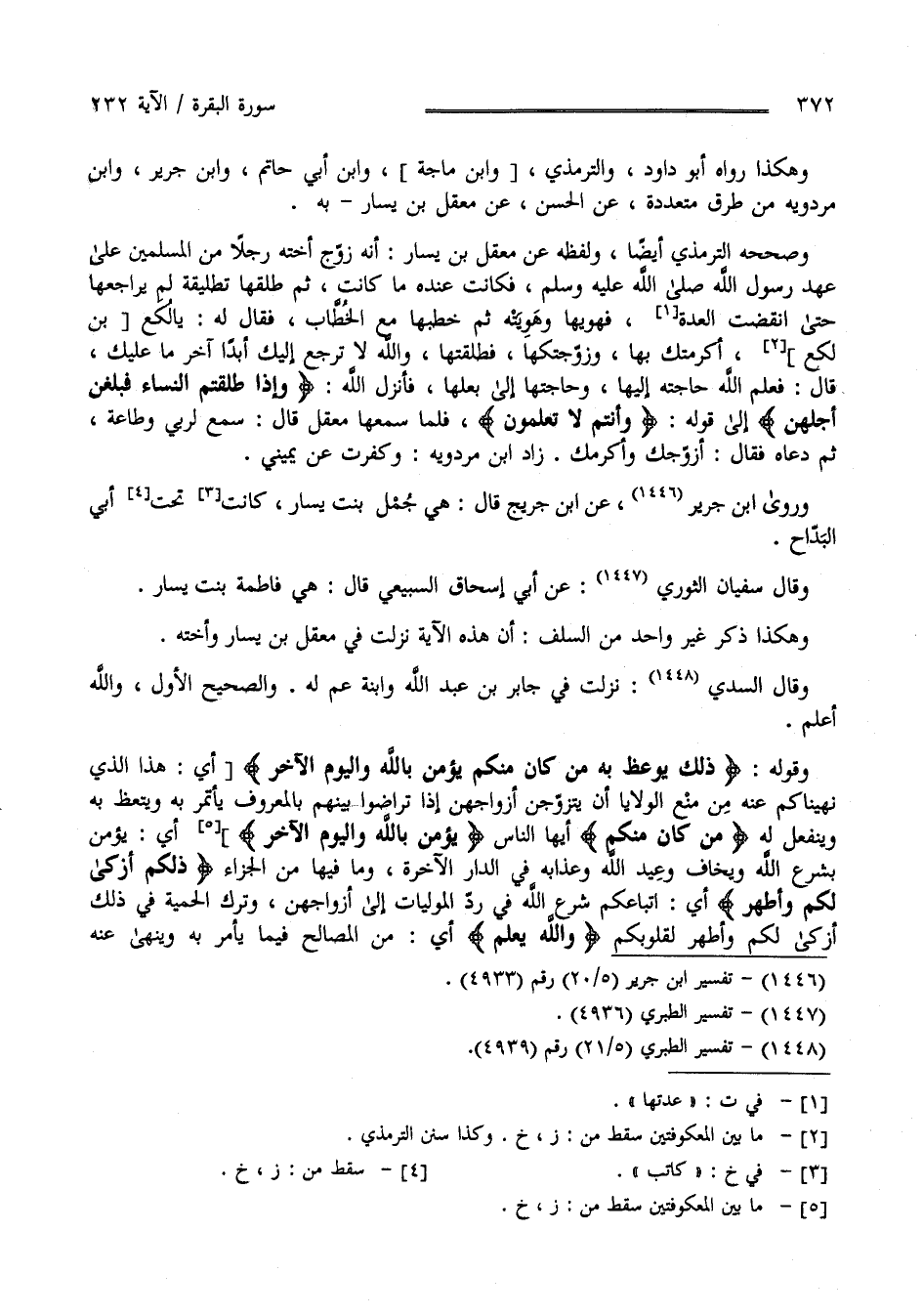 وَهَكَذَا رَوَاهُ أَبُو دَاوُد وَالتِّرْمِذِيّ وَابْن مَاجَهْ وَابْن أَبِي حَاتِم وَابْن جَرِير وَابْن مَرْدَوَيْهِ مِنْ طُرُق مُتَعَدِّدَة عَنْ الْحَسَن عَنْ مَعْقِل بْن يَسَار بِهِ وَصَحَّحَهُ التِّرْمِذِيّ أَيْضًا وَلَفْظه عَنْ مَعْقِل بْن يَسَار أَنَّهُ زَوَّجَ أُخْته رَجُلًا مِنْ الْمُسْلِمِينَ عَلَى عَهْد رَسُول اللَّه صَلَّى اللَّه عَلَيْهِ وَسَلَّمَ فَكَانَتْ عِنْده مَا كَانَتْ ثُمَّ طَلَّقَهَا تَطْلِيقَة لَمْ يُرَاجِعهَا حَتَّى اِنْقَضَتْ عِدَّتهَا فَهَوِيَهَا وَهَوِيَتْهُ ثُمَّ خَطَبَهَا مَعَ الْخُطَّاب فَقَالَ لَهُ يَا لُكَع بْن لُكَع أَكْرَمْتُك بِهَا وَزَوَّجْتُكهَا فَطَلَّقْتهَا وَاَللَّه لَا تَرْجِع إِلَيْك أَبَدًا آخِر مَا عَلَيْك قَالَ فَعَلِمَ اللَّه حَاجَته إِلَيْهَا وَحَاجَتهَا إِلَى بَعْلهَا فَأَنْزَلَ اللَّه " وَإِذَا طَلَّقْتُمْ النِّسَاء فَبَلَغْنَ أَجَلَهُنَّ " إِلَى قَوْله " وَأَنْتُمْ لَا تَعْلَمُونَ " فَلَمَّا سَمِعَهَا مَعْقِل قَالَ : سَمْعًا لِرَبِّي وَطَاعَة ثُمَّ دَعَاهُ فَقَالَ أُزَوِّجك وَأُكْرِمك زَادَ اِبْن مَرْدَوَيْهِ : وَكَفَّرْت عَنْ يَمِينِي .