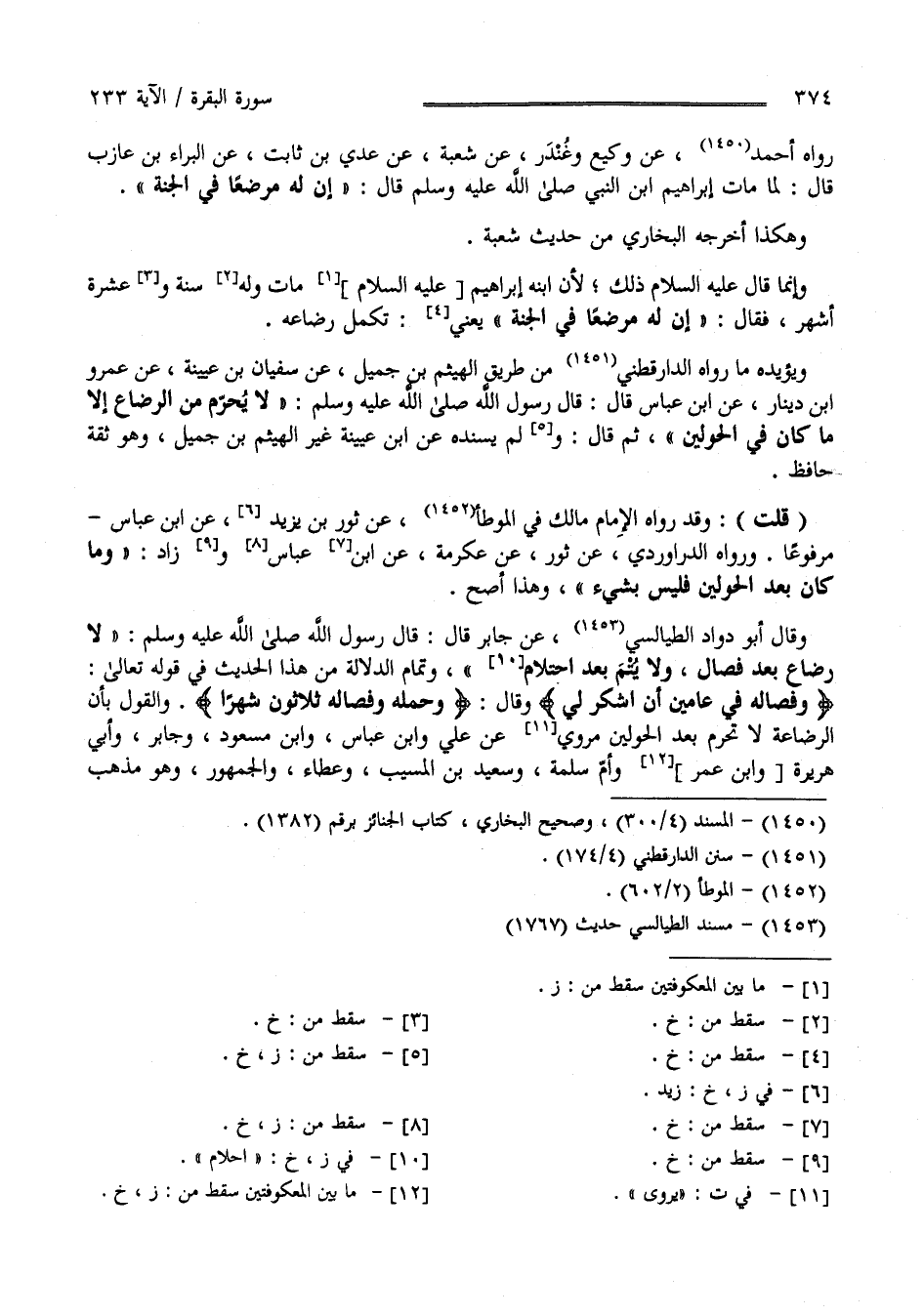 رَوَاهُ أَحْمَد عَنْ وَكِيع وَغُنْدَر عَنْ شُعْبَة عَنْ عَدِيّ بْن ثَابِت عَنْ الْبَرَاء بْن عَازِب قَالَ : لَمَّا مَاتَ إِبْرَاهِيم اِبْن النَّبِيّ - صَلَّى اللَّه عَلَيْهِ وَآلِهِ وَسَلَّمَ - قَالَ " إِنَّ اِبْنِي مَاتَ فِي الثَّدْي إِنَّ لَهُ مُرْضِعًا فِي الْجَنَّة " وَهَكَذَا أَخْرَجَهُ الْبُخَارِيّ مِنْ حَدِيث شُعْبَة وَإِنَّمَا قَالَ عَلَيْهِ السَّلَام ذَلِكَ لِأَنَّ اِبْنه إِبْرَاهِيم عَلَيْهِ السَّلَام مَاتَ وَلَهُ سَنَة وَعَشْرَة أَشْهُر فَقَالَ إِنَّ لَهُ مُرْضِعًا يَعْنِي تُكْمِل رَضَاعه وَيُؤَيِّدهُ مَا رَوَاهُ الدَّارَقُطْنِيّ مِنْ طَرِيق الْهَيْثَم بْن جَمِيل عَنْ سُفْيَان بْن عُيَيْنَة عَنْ عَمْرو بْن دِينَار عَنْ اِبْن عَبَّاس قَالَ : قَالَ رَسُول اللَّه - صَلَّى اللَّه عَلَيْهِ وَسَلَّمَ - " لَا يُحَرِّم مِنْ الرَّضَاع إِلَّا مَا كَانَ فِي الْحَوْلَيْنِ " ثُمَّ قَالَ وَلَمْ يُسْنِدهُ عَنْ اِبْن عُيَيْنَة غَيْر الْهَيْثَم بْن جَمِيل وَهُوَ ثِقَة حَافِظ.