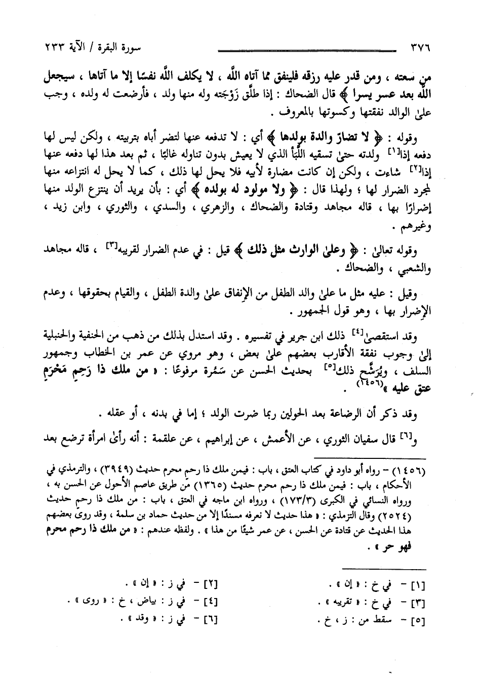 وَقَوْله تَعَالَى " وَعَلَى الْوَارِثِ مِثْلُ ذَلِكَ " قِيلَ فِي عَدَم الضِّرَار لِقَرِيبِهِ قَالَهُ مُجَاهِد وَالشَّعْبِيّ وَالضَّحَّاك وَقِيلَ عَلَيْهِ مِثْل مَا عَلَى وَالِد الطِّفْل مِنْ الْإِنْفَاق عَلَى وَالِدَة الطِّفْل وَالْقِيَام بِحُقُوقِهَا وَعَدَم الْإِضْرَار بِهَا وَهُوَ قَوْل الْجُمْهُور وَقَدْ اِسْتَقْصَى ذَلِكَ اِبْن جَرِير فِي تَفْسِيره وَقَدْ اِسْتَدَلَّ بِذَلِكَ مَنْ ذَهَبَ مِنْ الْحَنَفِيَّة وَالْحَنْبَلِيَّة إِلَى وُجُوب نَفَقَة الْأَقَارِب بَعْضهمْ عَلَى بَعْض وَهُوَ مَرْوِيّ عَنْ عُمَر بْن الْخَطَّاب وَجُمْهُور السَّلَف وَيُرَشِّح ذَلِكَ بِحَدِيثِ الْحَسَن عَنْ سَمُرَة مَرْفُوعًا " مَنْ مَلَكَ ذَا رَحِم مَحْرَم عَتَقَ عَلَيْهِ " وَقَدْ ذُكِرَ أَنَّ الرَّضَاعَة بَعْد الْحَوْلَيْنِ رُبَّمَا ضَرَّتْ الْوَلَد إِمَّا فِي بَدَنه أَوْ عَقْله وَقَالَ سُفْيَان الثَّوْرِيّ عَنْ الْأَعْمَش عَنْ إِبْرَاهِيم عَنْ عَلْقَمَة أَنَّهُ رَأَى اِمْرَأَة تُرْضِع بَعْد