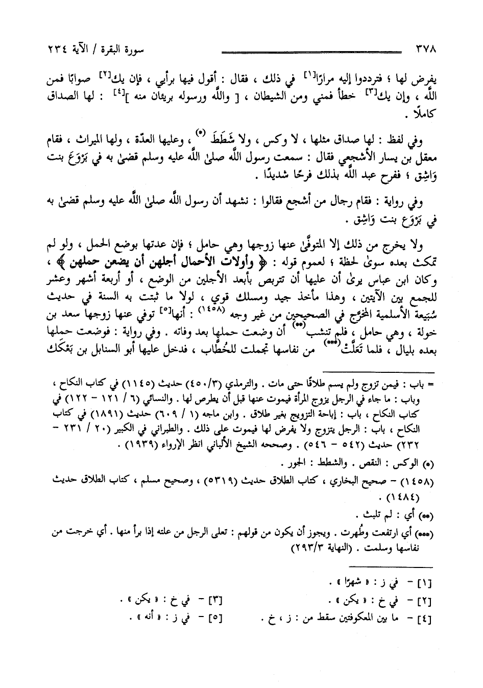 وَلَا يَخْرُج مِنْ ذَلِكَ إِلَّا الْمُتَوَفَّى عَنْهَا زَوْجهَا وَهِيَ حَامِل فَإِنَّ عِدَّتهَا بِوَضْعِ الْحَمْل وَلَوْ لَمْ تَمْكُث بَعْده سِوَى لَحْظَة لِعُمُومِ قَوْله" وَأُولَاتُ الْأَحْمَالِ أَجَلُهُنَّ أَنْ يَضَعْنَ حَمْلَهُنَّ " وَكَانَ اِبْن عَبَّاس يَرَى أَنَّ عَلَيْهَا أَنْ تَتَرَبَّص بِأَبْعَد الْأَجَلَيْنِ مِنْ الْوَضْع أَوْ أَرْبَعَة أَشْهُر وَعَشْرًا لِلْجَمْعِ بَيْن الْآيَتَيْنِ وَهَذَا مَأْخَذ جَيِّد وَمَسْلَك قَوِيّ لَوْلَا مَا ثَبَتَتْ بِهِ السُّنَّة فِي حَدِيث سُبَيْعَة الْأَسْلَمِيَّة الْمُخَرَّج فِي الصَّحِيحَيْنِ مِنْ غَيْر وَجْه أَنَّهَا تُوُفِّيَ عَنْهَا زَوْجهَا سَعْد بْن خَوْلَة وَهِيَ حَامِل فَلَمْ تَنْشَب أَنْ وَضَعَتْ حَمْلهَا بَعْد وَفَاته وَفِي رِوَايَة فَوَضَعَتْ حَمْلهَا بَعْده بِلَيَالٍ فَلَمَّا تَعَلَّتْ مِنْ نِفَاسهَا تَجَمَّلَتْ لِلْخُطَّابِ فَدَخَلَ عَلَيْهَا أَبُو السَّنَابِل بْن بَعْكَك