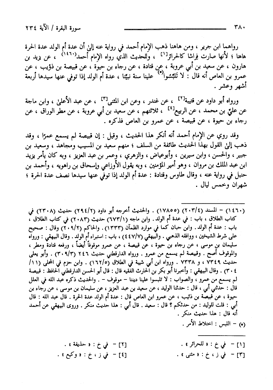 رَوَاهُمَا اِبْن جَرِير وَمِنْ هَاهُنَا ذَهَبَ الْإِمَام أَحْمَد فِي رِوَايَة عَنْهُ إِلَى أَنَّ عِدَّة أُمّ الْوَلَد عِدَّة الْحُرَّة هَاهُنَا لِأَنَّهَا صَارَتْ فِرَاشًا كَالْحَرَائِرِ وَلِلْحَدِيثِ الَّذِي رَوَاهُ الْإِمَام أَحْمَد عَنْ يَزِيد بْن هَارُون عَنْ سَعِيد بْن أَبِي عَرُوبَة عَنْ قَتَادَة عَنْ رَجَاء بْن حَيْوَة عَنْ قَبِيصَة بْن ذُؤَيْب عَنْ عَمْرو بْن الْعَاص أَنَّهُ قَالَ : لَا تُلَبِّسُوا عَلَيْنَا سُنَّة نَبِيّنَا : عِدَّة أُمّ الْوَلَد إِذَا تُوُفِّيَ عَنْهَا سَيِّدهَا أَرْبَعَة أَشْهُر وَعَشْرًا .
