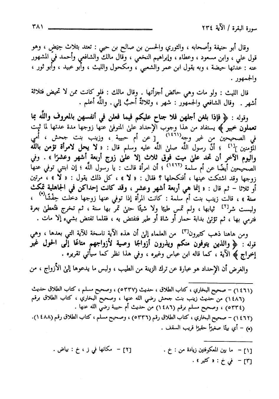 وَقَوْله " فَإِذَا بَلَغْنَ أَجَلَهُنَّ فَلَا جُنَاحَ عَلَيْكُمْ فِيمَا فَعَلْنَ فِي أَنْفُسِهِنَّ بِالْمَعْرُوفِ وَاَللَّهُ بِمَا تَعْمَلُونَ خَبِيرٌ " يُسْتَفَاد مِنْ هَذَا وُجُوب الْإِحْدَاد عَلَى الْمُتَوَفَّى عَنْهَا زَوْجهَا مُدَّة عِدَّتهَا لِمَا ثَبَتَ فِي الصَّحِيحَيْنِ مِنْ غَيْر وَجْه عَنْ أُمّ حَبِيبَة وَزَيْنَب بِنْت جَحْش أُمَّيْ الْمُؤْمِنِينَ أَنَّ رَسُول اللَّه صَلَّى اللَّه عَلَيْهِ وَسَلَّمَ قَالَ " لَا يَحِلّ لِامْرَأَةٍ تُؤْمِن بِاَللَّهِ وَالْيَوْم الْآخِر أَنْ تُحِدّ عَلَى مَيِّت فَوْق ثَلَاث إِلَّا عَلَى زَوْج أَرْبَعَة أَشْهُر وَعَشْرًا " وَفِي الصَّحِيحَيْنِ أَيْضًا عَنْ أُمّ سَلَمَة أَنَّ اِمْرَأَة قَالَتْ يَا رَسُول اللَّه إِنَّ اِبْنَتِي تُوُفِّيَ عَنْهَا زَوْجهَا وَقَدْ اِشْتَكَتْ عَيْنهَا أَفَنُكَحِّلهَا ؟ فَقَالَ " لَا " كُلّ ذَلِكَ يَقُول لَا مَرَّتَيْنِ أَوْ ثَلَاثًا ثُمَّ قَالَ " إِنَّمَا هِيَ أَرْبَعَة أَشْهُر وَعَشْرًا وَقَدْ كَانَتْ إِحْدَاكُنَّ فِي الْجَاهِلِيَّة تَمْكُث سَنَة " قَالَتْ زَيْنَب بِنْت أُمّ سَلَمَة : كَانَتْ الْمَرْأَة إِذَا تُوُفِّيَ عَنْهَا زَوْجهَا دَخَلَتْ حِفْشًا وَلَبِسَتْ شَرّ ثِيَابهَا وَلَمْ تَمَسّ طِيبًا وَلَا شَيْئًا حَتَّى تَمُرّ بِهَا سَنَة ثُمَّ تَخْرُج فَتُعْطَى بَعْرَة فَتَرْمِي بِهَا ثُمَّ تُؤْتَى بِدَابَّةٍ حِمَار أَوْ شَاة أَوْ طَيْر فَتَفْتَضّ بِهِ فَقَلَّمَا تَفْتَضّ بِشَيْءٍ إِلَّا مَاتَ وَمِنْ هَاهُنَا ذَهَبَ كَثِيرُونَ مِنْ الْعُلَمَاء إِلَى أَنَّ هَذِهِ الْآيَة نَاسِخَة لِلْآيَةِ الَّتِي بَعْدهَا وَهِيَ قَوْله " وَاَلَّذِينَ يُتَوَفَّوْنَ مِنْكُمْ وَيَذَرُونَ أَزْوَاجًا وَصِيَّةً لِأَزْوَاجِهِمْ مَتَاعًا إِلَى الْحَوْلِ غَيْرَ إِخْرَاجٍ " الْآيَة .