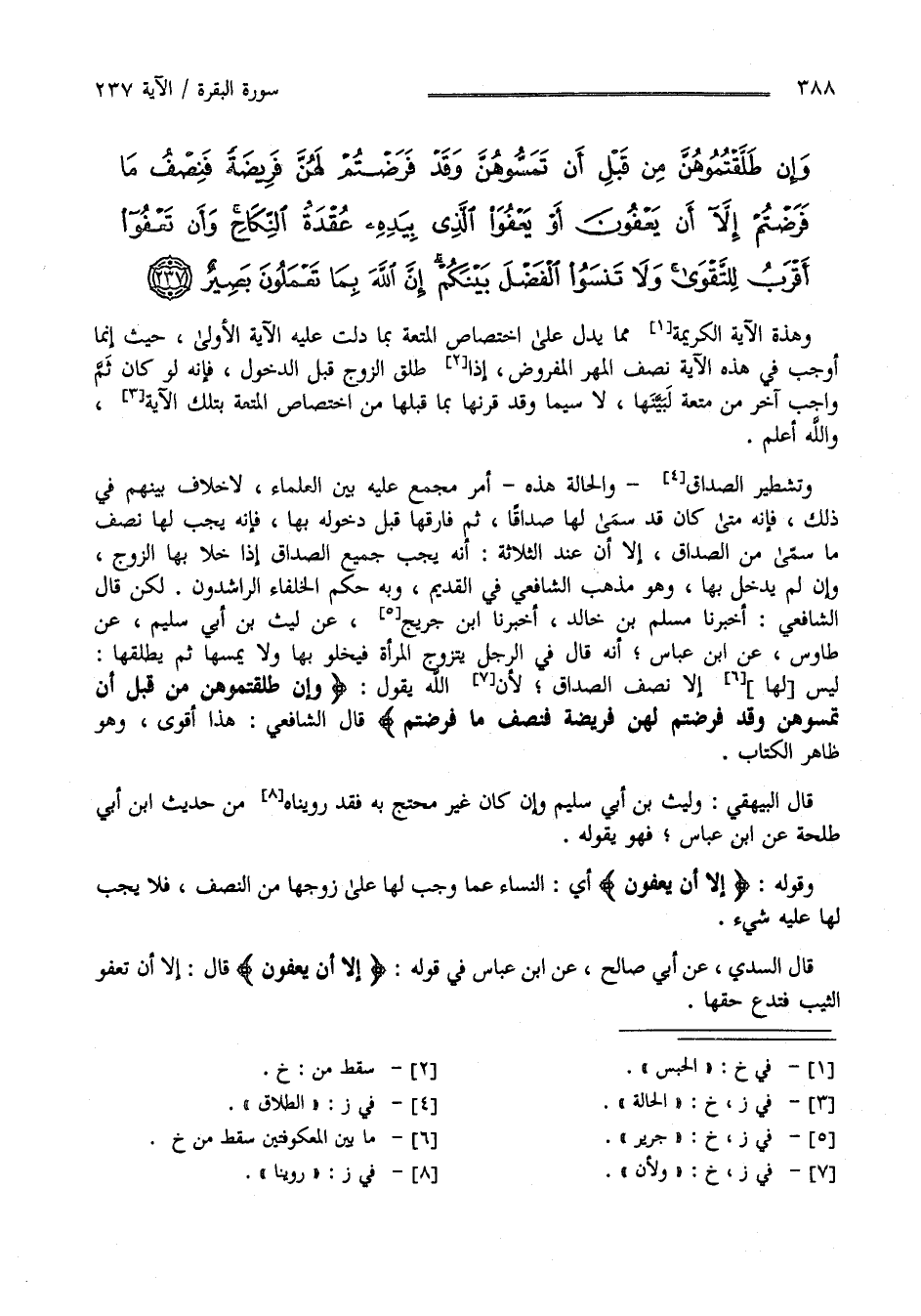 وَإِنْ طَلَّقْتُمُوهُنَّ مِنْ قَبْلِ أَنْ تَمَسُّوهُنَّ وَقَدْ فَرَضْتُمْ لَهُنَّ فَرِيضَةً فَنِصْفُ مَا فَرَضْتُمْ إِلَّا أَنْ يَعْفُونَ أَوْ يَعْفُوَ الَّذِي بِيَدِهِ عُقْدَةُ النِّكَاحِ وَأَنْ تَعْفُوا أَقْرَبُ لِلتَّقْوَى وَلَا تَنْسَوُا الْفَضْلَ بَيْنَكُمْ إِنَّ اللَّهَ بِمَا تَعْمَلُونَ بَصِيرٌ