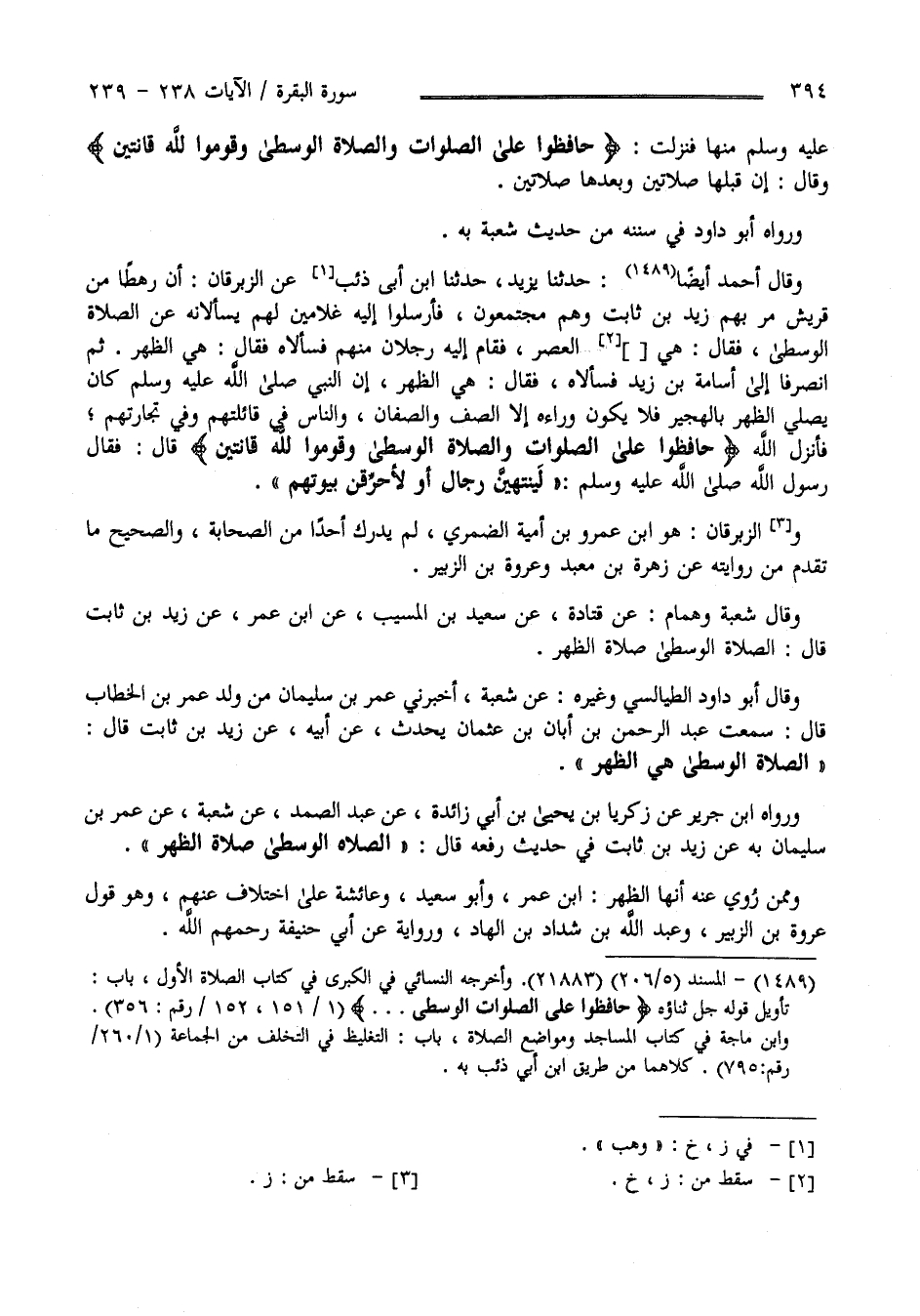 عَلَيْهِ وَسَلَّمَ - مِنْهَا فَنَزَلَتْ " حَافِظُوا عَلَى الصَّلَوَاتِ وَالصَّلَاةِ الْوُسْطَى وَقُومُوا لِلَّهِ قَانِتِينَ " وَقَالَ إِنَّ قَبْلهَا صَلَاتَيْنِ وَبَعْدهَا صَلَاتَيْنِ وَرَوَاهُ أَبُو دَاوُد فِي سُنَنه مِنْ حَدِيث شُعْبَة بِهِ وَقَالَ أَحْمَد أَيْضًا : حَدَّثَنَا يَزِيد بْن أَبِي وَهْب عَنْ الزِّبْرِقَان أَنَّ رَهْطًا مِنْ قُرَيْش مَرَّ بِهِمْ زَيْد بْن ثَابِت وَهُمْ مُجْتَمِعُونَ فَأَرْسَلُوا إِلَيْهِ غُلَامَيْنِ لَهُمْ يَسْأَلَانِهِ عَنْ الصَّلَاة الْوُسْطَى فَقَالَ هِيَ الْعَصْر فَقَامَ إِلَيْهِ رَجُلَانِ مِنْهُمْ فَسَأَلَاهُ فَقَالَ هِيَ الظُّهْر ثُمَّ اِنْصَرَفَا إِلَى أُسَامَة بْن زَيْد فَسَأَلَاهُ فَقَالَ هِيَ الظُّهْر إِنَّ النَّبِيّ - صَلَّى اللَّه عَلَيْهِ وَسَلَّمَ - كَانَ يُصَلِّي الظُّهْر بِالْهَجِيرِ فَلَا يَكُون وَرَاءَهُ إِلَّا الصَّفّ وَالصَّفَّانِ وَالنَّاس فِي قَائِلَتهمْ وَفِي تِجَارَتهمْ فَأَنْزَلَ اللَّه " حَافِظُوا عَلَى الصَّلَوَات وَالصَّلَاة الْوُسْطَى وَقُومُوا لِلَّهِ قَانِتِينَ " قَالَ : فَقَالَ رَسُول اللَّه - صَلَّى اللَّه عَلَيْهِ وَسَلَّمَ - " لَيَنْتَهِيَنَّ رِجَالٌ أَوْ لَأُحَرِّقَنَّ بُيُوتهمْ " وَالزِّبْرِقَان هُوَ اِبْن عَمْرو بْن أُمَيَّة الضَّمْرِيّ لَمْ يُدْرِك أَحَدًا مِنْ الصَّحَابَة وَالصَّحِيح مَا تَقَدَّمَ مِنْ رِوَايَته عَنْ زُهْرَة بْن مَعْبَد وَعُرْوَة بْن الزُّبَيْر وَقَالَ شُعْبَة وَهَمَّام عَنْ قَتَادَة عَنْ سَعِيد بْن الْمُسَيِّب عَنْ اِبْن عُمَر عَنْ زَيْد بْن ثَابِت قَالَ : الصَّلَاة الْوُسْطَى صَلَاة الظُّهْر.