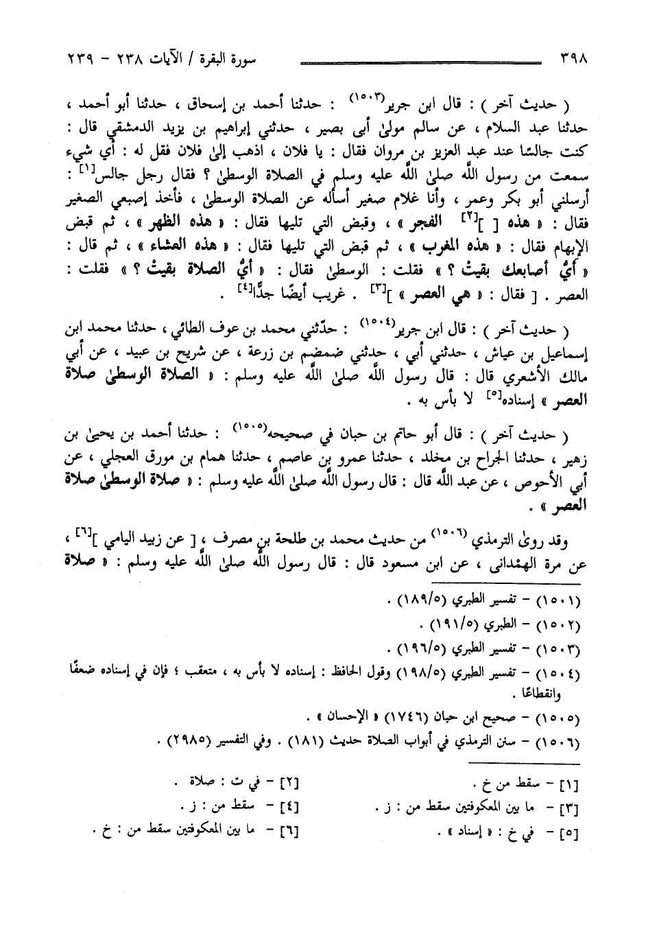 تَلِيهَا فَقَالَ هَذِهِ الظُّهْر ثُمَّ قَبَضَ الْإِبْهَام فَقَالَ هَذِهِ الْمَغْرِب ثُمَّ قَبَضَ الَّتِي تَلِيهَا فَقَالَ هَذِهِ الْعِشَاء ثُمَّ قَالَ : أَيّ أَصَابِعك بَقِيَتْ فَقُلْت الْوُسْطَى فَقَالَ أَيّ الصَّلَاة بَقِيَتْ ؟ فَقُلْت الْعَصْر فَقَالَ هِيَ الْعَصْر غَرِيب أَيْضًا جِدًّا " حَدِيث آخَر " قَالَ اِبْن جَرِير : حَدَّثَنِي مُحَمَّد بْن عَوْف الطَّائِيّ حَدَّثَنَا مُحَمَّد بْن إِسْمَاعِيل بْن عَيَّاش حَدَّثَنِي أَبِي حَدَّثَنِي أَبُو ضَمْضَم بْن زُرْعَة عَنْ شُرَيْح بْن عُبَيْد عَنْ أَبِي مَالِك الْأَشْعَرِيّ قَالَ : قَالَ رَسُول اللَّه - صَلَّى اللَّه عَلَيْهِ وَسَلَّمَ - الصَّلَاة الْوُسْطَى صَلَاة الْعَصْر إِسْنَاده لَا بَأْس بِهِ " حَدِيث آخَر " قَالَ أَبُو حَاتِم بْن حِبَّان فِي صَحِيحه : حَدَّثَنَا أَحْمَد بْن يَحْيَى بْن زُهَيْر حَدَّثَنَا الْجَرَّاح بْن مَخْلَد حَدَّثَنَا عَمْرو بْن عَاصِم حَدَّثَنَا هَمَّام بْن مُوَرِّق الْعِجْلِيّ عَنْ أَبِي الْأَحْوَص عَنْ عَبْد اللَّه قَالَ : قَالَ رَسُول اللَّه - صَلَّى اللَّه عَلَيْهِ وَسَلَّمَ - صَلَاة الْوُسْطَى صَلَاة الْعَصْر وَقَدْ رَوَى التِّرْمِذِيّ مِنْ حَدِيث مُحَمَّد بْن طَلْحَة بْن مُصَرِّف عَنْ زُبَيْد الْيَامِيّ عَنْ مُرَّة الْهَمْدَانِيّ عَنْ اِبْن مَسْعُود قَالَ : قَالَ رَسُول اللَّه - صَلَّى اللَّه عَلَيْهِ وَسَلَّمَ – صَلَاة