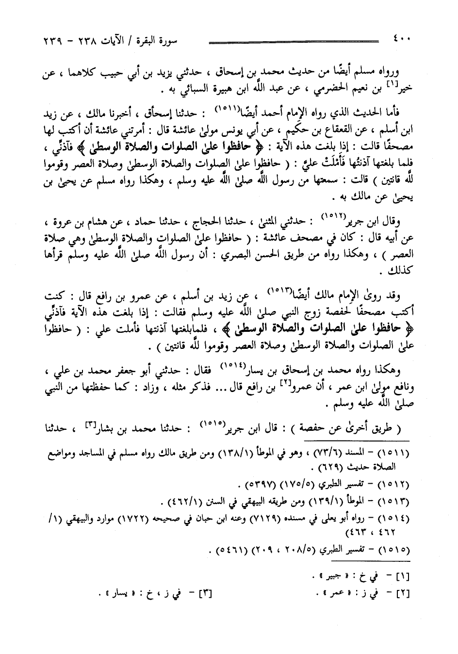 السَّبَائِيّ بِهِ فَأَمَّا الْحَدِيث الَّذِي رَوَاهُ الْإِمَام أَحْمَد أَيْضًا حَدَّثَنَا إِسْحَاق أَخْبَرَنِي مَالِك عَنْ زَيْد بْن أَسْلَمَ عَنْ الْقَعْقَاع بْن حَكِيم عَنْ أَبِي يُونُس مَوْلَى عَائِشَة قَالَ : أَمَرَتْنِي عَائِشَة أَنْ أَكْتُب لَهَا مُصْحَفًا قَالَتْ : إِذَا بَلَغَتْ هَذِهِ الْآيَة " حَافِظُوا عَلَى الصَّلَوَات وَالصَّلَاة الْوُسْطَى " فَآذِنِّي فَلَمَّا بَلَغْتهَا آذَنْتهَا فَأَمْلَتْ عَلَيَّ " حَافِظُوا عَلَى الصَّلَوَات وَالصَّلَاة الْوُسْطَى وَصَلَاة الْعَصْر وَقُومُوا لِلَّهِ قَانِتِينَ " قَالَتْ : سَمِعْتهَا مِنْ رَسُول اللَّه صَلَّى اللَّه عَلَيْهِ وَسَلَّمَ وَهَكَذَا رَوَاهُ مُسْلِم عَنْ يَحْيَى بْن يَحْيَى عَنْ مَالِك بِهِ وَقَالَ اِبْن جَرِير : حَدَّثَنِي اِبْن الْمُثَنَّى حَدَّثَنَا الْحَجَّاج حَدَّثَنَا حَمَّاد عَنْ هِشَام بْن عُرْوَة عَنْ أَبِيهِ قَالَ : كَانَ فِي مُصْحَف عَائِشَة " حَافِظُوا عَلَى الصَّلَوَات وَالصَّلَاة الْوُسْطَى وَهِيَ صَلَاة الْعَصْر " وَهَكَذَا رَوَاهُ مِنْ طَرِيق الْحَسَن الْبَصْرِيّ أَنَّ رَسُول اللَّه - صَلَّى اللَّه عَلَيْهِ وَسَلَّمَ - قَرَأَهَا كَذَلِكَ وَقَدْ رَوَى الْإِمَام مَالِك أَيْضًا عَنْ زَيْد بْن أَسْلَمَ عَنْ عَمْرو بْن رَافِع قَالَ : كُنْت أَكْتُب مُصْحَفًا لِحَفْصَة زَوْج النَّبِيّ - صَلَّى اللَّه عَلَيْهِ وَسَلَّمَ - فَقَالَتْ : إِذَا بَلَغْت هَذِهِ الْآيَة فَآذِنِّي " حَافِظُوا عَلَى الصَّلَوَات وَالصَّلَاة الْوُسْطَى " فَلَمَّا بَلَغْتهَا آذَنْتهَا فَأَمْلَتْ عَلَيَّ " حَافِظُوا عَلَى الصَّلَوَات وَالصَّلَاة الْوُسْطَى وَصَلَاة الْعَصْر وَقُومُوا لِلَّهِ قَانِتِينَ " وَهَكَذَا رَوَاهُ مُحَمَّد بْن إِسْحَاق بْن يَسَار فَقَالَ : حَدَّثَنِي أَبُو جَعْفَر مُحَمَّد بْن عَلِيّ وَنَافِع مَوْلَى اِبْن عُمَر أَنَّ عُمَر بْن نَافِع قَالَ : فَذَكَرَ مِثْله وَزَادَ كَمَا حَفِظَتْهَا مِنْ النَّبِيّ - صَلَّى اللَّه عَلَيْهِ وَسَلَّمَ