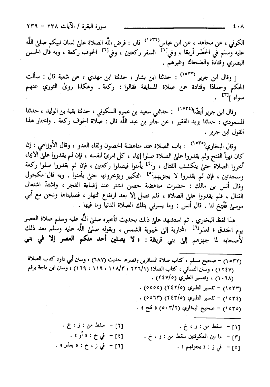 الْكُوفِيّ عَنْ مُجَاهِد عَنْ اِبْن عَبَّاس قَالَ : فَرَضَ اللَّه الصَّلَاة عَلَى لِسَان نَبِيّكُمْ - صَلَّى اللَّه عَلَيْهِ وَسَلَّمَ - فِي الْحَضَر أَرْبَعًا وَفِي السَّفَر رَكْعَتَيْنِ وَفِي الْخَوْف رَكْعَة وَبِهِ قَالَ الْحَسَن الْبَصْرِيّ وَقَتَادَة وَالضَّحَّاك وَغَيْرهمْ وَقَالَ اِبْن جَرِير : حَدَّثَنَا اِبْن بَشَّار حَدَّثَنَا اِبْن مَهْدِيّ عَنْ شُعْبَة قَالَ : سَأَلْت الْحَكَم وَحَمَّادًا وَقَتَادَة عَنْ صَلَاة الْمُسَايَفَة فَقَالُوا : رَكْعَة وَهَكَذَا رَوَى الثَّوْرِيّ عَنْهُمْ سَوَاء وَقَالَ اِبْن جَرِير أَيْضًا : حَدَّثَنِي سَعِيد بْن عَمْرو السَّكُونِيّ حَدَّثَنَا بَقِيَّة بْن الْوَلِيد حَدَّثَنَا الْمَسْعُودِيّ حَدَّثَنَا يَزِيد الْفَقِير عَنْ جَابِر بْن عَبْد اللَّه قَالَ : صَلَاة الْخَوْف رَكْعَة وَاخْتَارَ هَذَا الْقَوْل اِبْن جَرِير وَقَالَ الْبُخَارِيّ" بَاب الصَّلَاة عِنْد مُنَاهَضَة الْحُصُون وَلِقَاء الْعَدُوّ " وَقَالَ الْأَوْزَاعِيّ : إِنْ كَانَ تَهَيَّأَ الْفَتْح وَلَمْ يَقْدِرُوا عَلَى الصَّلَاة صَلَّوْا إِيمَاء كُلّ اِمْرِئٍ لِنَفْسِهِ فَإِنْ لَمْ يَقْدِرُوا عَلَى الْإِيمَاء أَخَّرُوا الصَّلَاة حَتَّى يَنْكَشِف الْقِتَال وَيَأْمَنُوا فَيُصَلُّوا رَكْعَتَيْنِ فَإِنْ لَمْ يَقْدِرُوا صَلَّوْا رَكْعَة وَسَجْدَتَيْنِ فَإِنْ لَمْ يَقْدِرُوا لَا يَجْزِيهِمْ التَّكْبِير وَيُؤَخِّرُونَهَا حَتَّى يَأْمَنُوا وَبِهِ قَالَ مَكْحُول وَقَالَ أَنَس بْن مَالِك : حَضَرْت مُنَاهَضَة حِصْن تَسْتُر عِنْد إِضَاءَة الْفَجْر وَاشْتَدَّ اِشْتِعَال الْقِتَال فَلَمْ يَقْدِرُوا عَلَى الصَّلَاة فَلَمْ نُصَلِّ إِلَّا بَعْد اِرْتِفَاع النَّهَار فَصَلَّيْنَاهَا وَنَحْنُ مَعَ أَبِي مُوسَى فَفُتِحَ لَنَا قَالَ أَنَس : وَمَا يَسُرّنِي بِتِلْكَ الصَّلَاة الدُّنْيَا وَمَا فِيهَا .