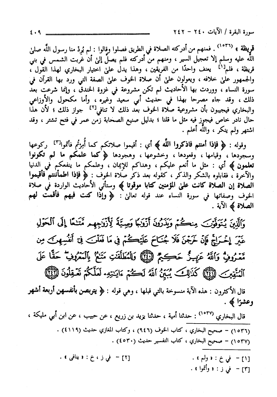 قَالَ الْأَكْثَرُونَ هَذِهِ الْآيَة مَنْسُوخَة بِاَلَّتِي قَبْلهَا وَهِيَ قَوْله " يَتَرَبَّصْنَ بِأَنْفُسِهِنَّ أَرْبَعَة أَشْهُر وَعَشْرًا " قَالَ الْبُخَارِيّ : حَدَّثَنَا أُمَيَّة حَدَّثَنَا يَزِيد بْن زُرَيْع عَنْ حَبِيب عَنْ اِبْن أَبِي مُلَيْكَة