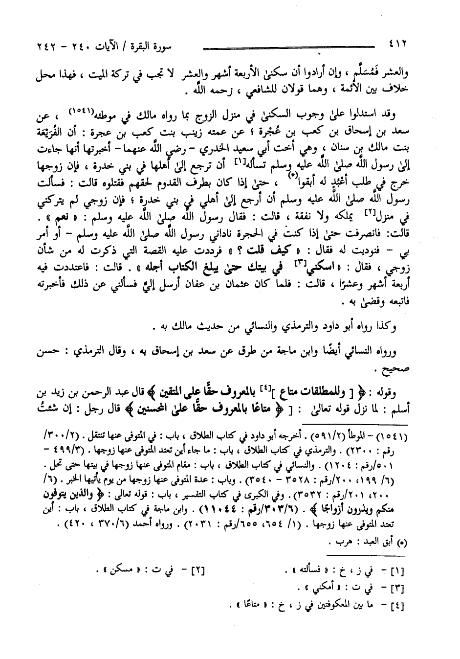 الْخُدْرِيّ رَضِيَ اللَّه عَنْهُمَا أَخْبَرَتْهَا أَنَّهَا جَاءَتْ إِلَى رَسُول اللَّه - صَلَّى اللَّه عَلَيْهِ وَسَلَّمَ - تَسْأَلهُ أَنْ تَرْجِع إِلَى أَهْلهَا فِي بَنِي خُدْرَة فَإِنَّ زَوْجهَا خَرَجَ فِي طَلَب أَعْبُد لَهُ أَبَقُوا حَتَّى إِذَا كَانَ بِطَرَفِ الْقَدُومِ لَحِقَهُمْ فَقَتَلُوهُ قَالَتْ : فَسَأَلْت رَسُول اللَّه صَلَّى اللَّه عَلَيْهِ وَآلِهِ وَسَلَّمَ أَنْ أَرْجِع إِلَى أَهْلِي فِي بَنِي خُدْرَة فَإِنَّ زَوْجِي لَمْ يَتْرُكنِي فِي مَسْكَن يَمْلِكهُ وَلَا نَفَقَة قَالَتْ : فَقَالَ رَسُول اللَّه - صَلَّى اللَّه عَلَيْهِ وَسَلَّمَ - نَعَمْ قَالَتْ فَانْصَرَفْت حَتَّى إِذَا كُنْت فِي الْحُجْرَة نَادَانِي رَسُول اللَّه - صَلَّى اللَّه عَلَيْهِ وَسَلَّمَ - أَوْ أَمَرَ بِي فَنُودِيت لَهُ فَقَالَ كَيْف قُلْت ؟ فَرَدَدْت عَلَيْهِ الْقِصَّة الَّتِي ذَكَرْت لَهُ مِنْ شَأْن زَوْجِي فَقَالَ اُمْكُثِي فِي بَيْتك حَتَّى يَبْلُغ الْكِتَابُ أَجَله قَالَتْ فَاعْتَدَدْت فِيهِ أَرْبَعَة أَشْهُر وَعَشْرًا قَالَتْ : فَلَمَّا كَانَ عُثْمَان بْن عَفَّان أَرْسَلَ إِلَيَّ فَسَأَلَنِي عَنْ ذَلِكَ فَأَخْبَرْته فَاتَّبَعَهُ وَقَضَى بِهِ وَكَذَا رَوَاهُ أَبُو دَاوُد وَالتِّرْمِذِيّ وَالنَّسَائِيّ مِنْ حَدِيث مَالِك بِهِ .