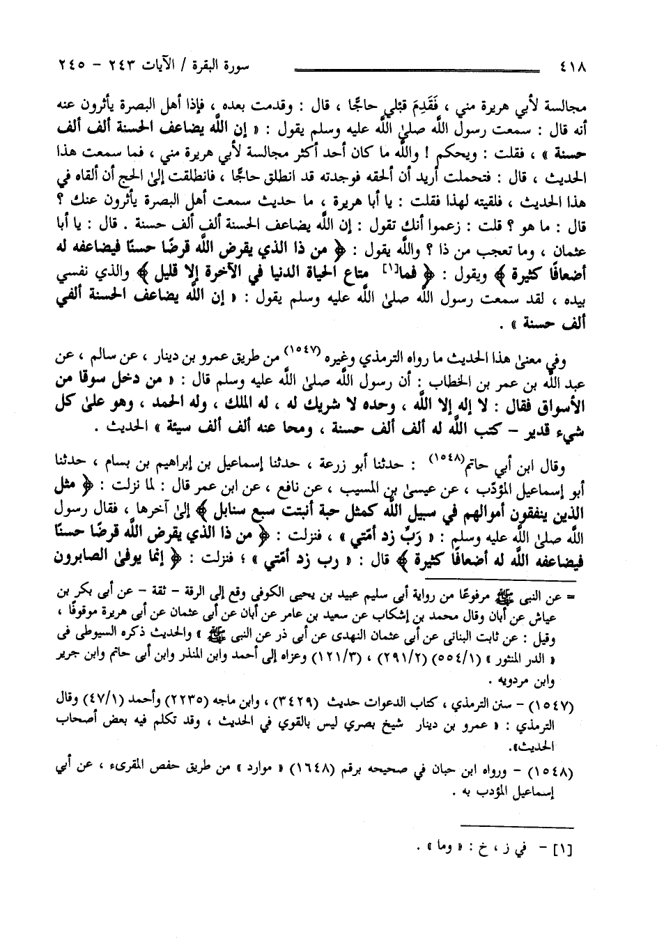 مُجَالَسَة لِأَبِي هُرَيْرَة مِنِّي فَقَدِمَ قَبْلِي حَاجًّا قَالَ : وَقَدِمْت بَعْده فَإِذَا أَهْل الْبَصْرَة يَأْثُرُونَ عَنْهُ أَنَّهُ قَالَ : سَمِعْت رَسُول اللَّه - صَلَّى اللَّه عَلَيْهِ وَسَلَّمَ - يَقُول إِنَّ اللَّه يُضَاعِف الْحَسَنَة أَلْف أَلْف حَسَنَة " فَقُلْت وَيْحَكُمْ وَاَللَّه مَا كَانَ أَحَد أَكْثَر مُجَالَسَة لِأَبِي هُرَيْرَة مِنِّي فَمَا سَمِعْت هَذَا الْحَدِيث قَالَ : فَتَحَمَّلْت أُرِيد أَنْ أَلْحَقَهُ فَوَجَدْته قَدْ اِنْطَلَقَ حَاجًّا فَانْطَلَقْت إِلَى الْحَجّ أَنْ أَلْقَاهُ فِي هَذَا الْحَدِيث فَلَقِيته لِهَذَا فَقُلْت : يَا أَبَا هُرَيْرَة مَا حَدِيث سَمِعْت أَهْل الْبَصْرَة يَأْثُرُونَ عَنْك ؟ قَالَ مَا هُوَ ؟ قُلْت : زَعَمُوا أَنَّك تَقُول إِنَّ اللَّه يُضَاعِف الْحَسَنَة أَلْف أَلْف حَسَنَة قَالَ : يَا أَبَا عُثْمَان وَمَا تَعْجَب مِنْ ذَا وَاَللَّه يَقُول " مَنْ ذَا الَّذِي يُقْرِض اللَّهَ قَرْضًا حَسَنًا فَيُضَاعِفهُ لَهُ أَضْعَافًا كَثِيرَة " وَيَقُول " مَا مَتَاع الْحَيَاة الدُّنْيَا فِي الْآخِرَة إِلَّا قَلِيل " وَاَلَّذِي نَفْسِي بِيَدِهِ لَقَدْ سَمِعْت رَسُول اللَّه - صَلَّى اللَّه عَلَيْهِ وَسَلَّمَ - يَقُول إِنَّ اللَّه يُضَاعِف الْحَسَنَة أَلْفَيْ أَلْف حَسَنَة " وَفِي مَعْنَى هَذَا الْحَدِيث مَا رَوَاهُ التِّرْمِذِيّ وَغَيْره مِنْ طَرِيق عَمْرو بْن دِينَار عَنْ سَالِم عَنْ عَبْد اللَّه بْن عُمَر بْن الْخَطَّاب أَنَّ رَسُول اللَّه - صَلَّى اللَّه عَلَيْهِ وَسَلَّمَ - قَالَ " مَنْ دَخَلَ سُوقًا مِنْ الْأَسْوَاق فَقَالَ لَا إِلَه إِلَّا اللَّه وَحْده لَا شَرِيك لَهُ لَهُ الْمُلْك وَلَهُ الْحَمْدُ وَهُوَ عَلَى كُلّ شَيْء قَدِيرٌ كَتَبَ اللَّه لَهُ أَلْف أَلْف حَسَنَة وَمَحَا عَنْهُ أَلْف أَلْف سَيِّئَة