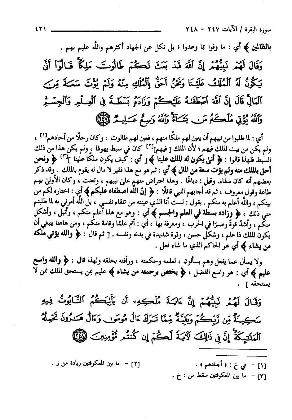 وَقَالَ لَهُمْ نَبِيُّهُمْ إِنَّ اللَّهَ قَدْ بَعَثَ لَكُمْ طَالُوتَ مَلِكًا قَالُوا أَنَّى يَكُونُ لَهُ الْمُلْكُ عَلَيْنَا وَنَحْنُ أَحَقُّ بِالْمُلْكِ مِنْهُ وَلَمْ يُؤْتَ سَعَةً مِنَ الْمَالِ قَالَ إِنَّ اللَّهَ اصْطَفَاهُ عَلَيْكُمْ وَزَادَهُ بَسْطَةً فِي الْعِلْمِ وَالْجِسْمِ وَاللَّهُ يُؤْتِي مُلْكَهُ مَنْ يَشَاءُ وَاللَّهُ وَاسِعٌ عَلِيمٌ (247)
