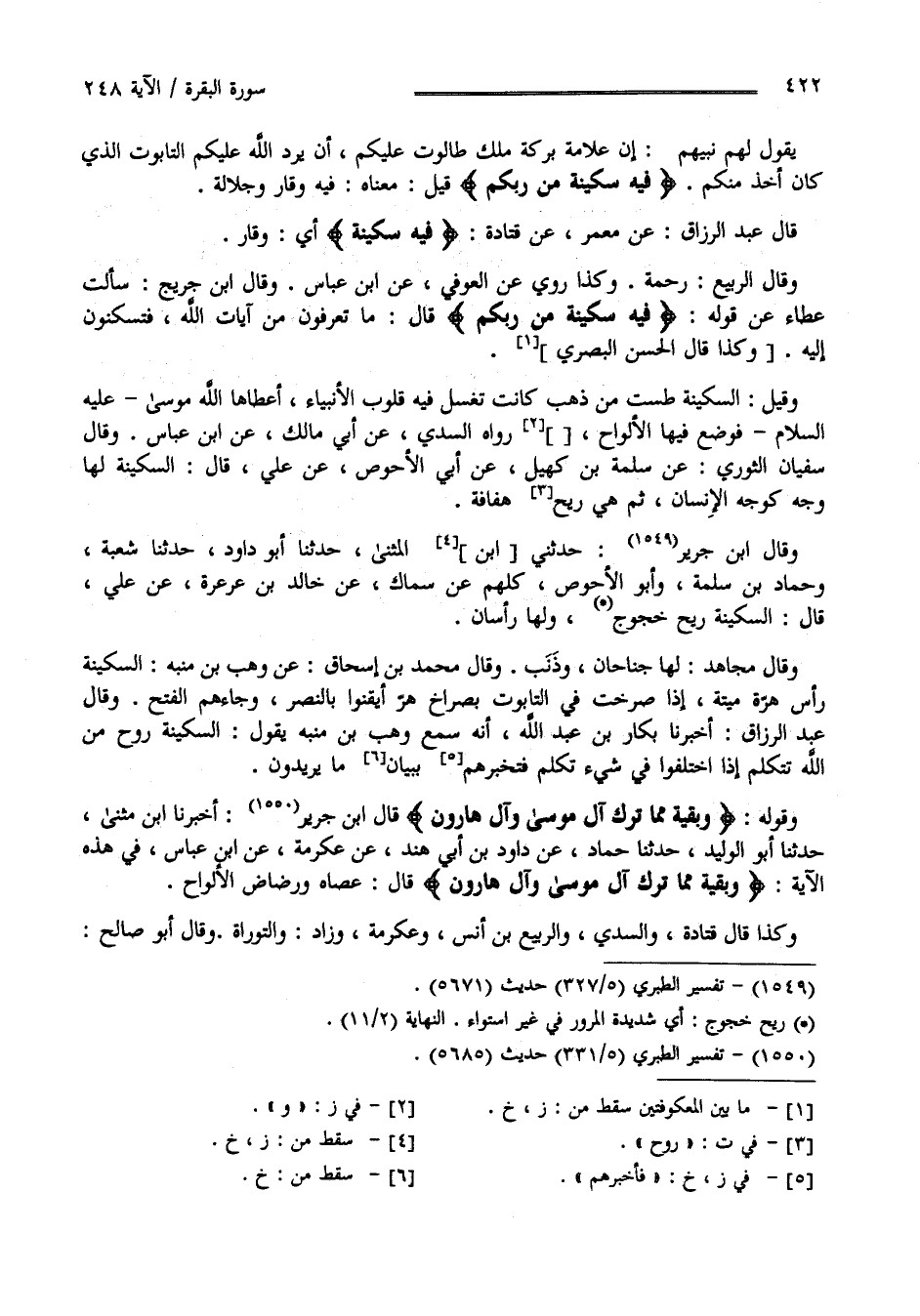 يَقُول لَهُمْ نَبِيُّهُمْ إِنَّ عَلَامَة بَرَكَة مُلْك طَالُوت عَلَيْكُمْ أَنْ يَرُدَّ اللَّهُ عَلَيْكُمْ التَّابُوت الَّذِي كَانَ أُخِذَ مِنْكُمْ " وَفِيهِ سَكِينَةٌ مِنْ رَبّكُمْ " قِيلَ مَعْنَاهُ فِيهِ وَقَار وَجَلَالَة قَالَ عَبْد الرَّزَّاق عَنْ مَعْمَر عَنْ قَتَادَة " فِيهِ سَكِينَة " أَيْ وَقَار وَقَالَ الرَّبِيع : رَحْمَة وَكَذَا رُوِيَ عَنْ الْعَوْفِيّ عَنْ اِبْن عَبَّاس وَقَالَ اِبْن جُرَيْج : سَأَلْت عَطَاء عَنْ قَوْله " فِيهِ سَكِينَة مِنْ رَبّكُمْ " قَالَ : مَا تَعْرِفُونَ مِنْ آيَات اللَّه فَتَسْكُنُونَ إِلَيْهِ وَكَذَا قَالَ الْحَسَن الْبَصْرِيّ وَقِيلَ السَّكِينَة طَسْت مِنْ ذَهَب كَانَتْ تُغْسَل فِيهِ قُلُوب الْأَنْبِيَاء أَعْطَاهَا اللَّه مُوسَى عَلَيْهِ السَّلَام فَوَضَعَ فِيهَا الْأَلْوَاح وَرَوَاهُ السُّدِّيّ عَنْ أَبِي مَالِك عَنْ اِبْن عَبَّاس وَقَالَ سُفْيَان الثَّوْرِيّ : عَنْ سَلَمَة بْن كُهَيْل عَنْ أَبِي الْأَحْوَص عَنْ عَلِيّ قَالَ : السَّكِينَة لَهَا وَجْه كَوَجْهِ الْإِنْسَان ثُمَّ هِيَ رُوح هَفَّافَة وَقَالَ اِبْن جَرِير : حَدَّثَنِي الْمُثَنَّى حَدَّثَنَا أَبُو دَاوُد حَدَّثَنَا شُعْبَة وَحَمَّاد بْن سَلَمَة وَأَبُو الْأَحْوَص كُلّهمْ عَنْ سِمَاك عَنْ خَالِد بْن عُرْعُرَة عَنْ عَلِيّ قَالَ : السَّكِينَة رِيح خَجُوج وَلَهَا رَأْسَانِ وَقَالَ مُجَاهِد لَهَا جَنَاحَانِ وَذَنَب وَقَالَ مُحَمَّد بْن إِسْحَاق عَنْ وَهْب بْن مُنَبِّه : السَّكِينَة رَأْس هِرَّة مَيِّتَة إِذَا صَرَخَتْ فِي التَّابُوت بِصُرَاخِ هِرّ أَيْقَنُوا بِالنَّصْرِ وَجَاءَهُمْ الْفَتْح وَقَالَ عَبْد الرَّزَّاق : أَخْبَرَنَا بَكَّار بْن عَبْد اللَّه أَنَّهُ سَمِعَ وَهْب بْن مُنَبِّه يَقُول : السَّكِينَة رُوح مِنْ اللَّه تَتَكَلَّم إِذَا اِخْتَلَفُوا فِي شَيْء تَكَلَّمَ فَتُخْبِرهُمْ بِبَيَانِ مَا يُرِيدُونَ .