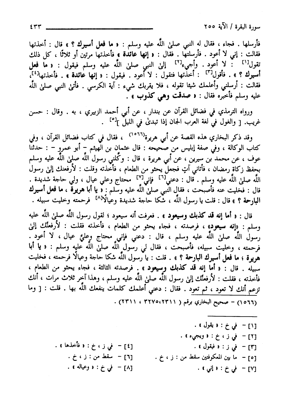 وَقَدْ ذَكَرَ الْبُخَارِيّ هَذِهِ الْقِصَّة عَنْ أَبِي هُرَيْرَة فَقَالَ فِي كِتَاب فَضَائِل الْقُرْآن وَفِي كِتَاب الْوَكَالَة وَفِي صِفَة إِبْلِيس مِنْ صَحِيحَة قَالَ عُثْمَان بْن الْهَيْثَم أَبُو عَمْرو حَدَّثَنَا عَوْف عَنْ مُحَمَّد بْن سِيرِينَ عَنْ أَبِي هُرَيْرَة قَالَ : وَكَّلَنِي رَسُول اللَّه - صَلَّى اللَّه عَلَيْهِ وَسَلَّمَ - بِحِفْظِ زَكَاة رَمَضَان فَأَتَانِي آتٍ فَجَعَلَ يَحْثُو مِنْ الطَّعَام فَأَخَذْته وَقُلْت : لَأَرْفَعَنَّكَ إِلَى رَسُول اللَّه - صَلَّى اللَّه عَلَيْهِ وَسَلَّمَ - قَالَ : دَعْنِي فَإِنِّي مُحْتَاجٌ وَعَلَيَّ عِيَالٌ وَلِي حَاجَةٌ شَدِيدَةٌ قَالَ فَخَلَّيْت عَنْهُ فَأَصْبَحْت فَقَالَ النَّبِيّ - صَلَّى اللَّه عَلَيْهِ وَسَلَّمَ - يَا أَبَا هُرَيْرَة مَا فَعَلَ أَسِيرك الْبَارِحَة ؟ قَالَ : قُلْت يَا رَسُول اللَّه شَكَا حَاجَة شَدِيدَة وَعِيَالًا فَرَحِمْته وَخَلَّيْت سَبِيله قَالَ أَمَّا إِنَّهُ قَدْ كَذَبَك وَسَيَعُودُ فَعَرَفْت أَنَّهُ سَيَعُودُ لِقَوْلِ رَسُول اللَّه - صَلَّى اللَّه عَلَيْهِ وَسَلَّمَ - أَنَّهُ سَيَعُودُ فَرَصَدْتُهُ فَجَاءَ يَحْثُو مِنْ الطَّعَام فَأَخَذْته فَقُلْت لَأَرْفَعَنَّكَ إِلَى رَسُول اللَّه صَلَّى اللَّه عَلَيْهِ وَسَلَّمَ قَالَ : دَعْنِي فَإِنِّي مُحْتَاج وَعَلَيَّ عِيَال لَا أَعُود فَرَحْمَته وَخَلَّيْت سَبِيله فَأَصْبَحْت فَقَالَ لِي رَسُول اللَّه - صَلَّى اللَّه عَلَيْهِ وَسَلَّمَ - يَا أَبَا هُرَيْرَة مَا فَعَلَ أَسِيرك الْبَارِحَة قُلْت يَا رَسُول اللَّه شَكَا حَاجَة وَعِيَالًا فَرَحْمَته فَخَلَّيْت سَبِيله قَالَ أَمَّا إِنَّهُ قَدْ كَذَبَك وَسَيَعُودُ فَرَصَدْته الثَّالِثَة فَجَاءَ يَحْثُو مِنْ الطَّعَام فَأَخَذْته فَقُلْت لَأَرْفَعَنَّكَ إِلَى رَسُول اللَّه بِهَا وَهَذَا آخِر ثَلَاث مَرَّات أَنَّك تَزْعُم أَنَّك لَا تَعُود ثُمَّ تَعُود فَقَالَ : دَعْنِي أُعَلِّمك كَلِمَات يَنْفَعك اللَّه بِهَا قُلْت وَمَا