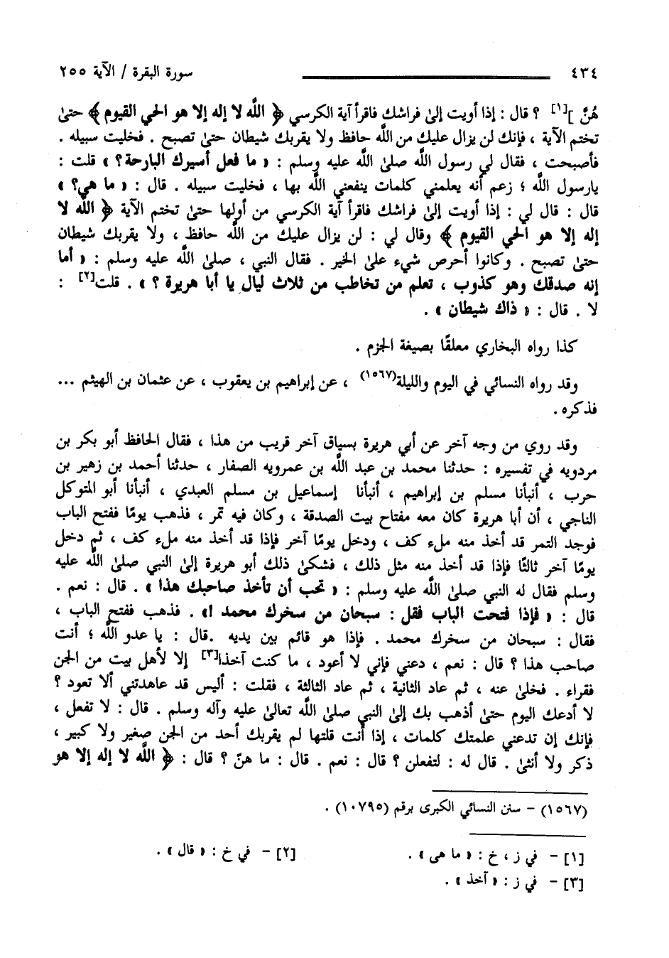 هِيَ ؟ قَالَ : إِذَا أَوَيْت إِلَى فِرَاشك فَاقْرَأْ آيَة الْكُرْسِيّ " اللَّه لَا إِلَه إِلَّا هُوَ الْحَيّ الْقَيُّوم " حَتَّى تَخْتِم الْآيَة فَإِنَّك لَنْ يَزَال عَلَيْك مِنْ اللَّه حَافِظ وَلَا يَقْرَبك شَيْطَان حَتَّى تُصْبِح فَخَلَّيْت سَبِيله فَأَصْبَحْت فَقَالَ لِي رَسُول اللَّه - صَلَّى اللَّه عَلَيْهِ وَسَلَّمَ - مَا فَعَلَ أَسِيرك الْبَارِحَة ؟ قُلْت يَا رَسُول اللَّه زَعَمَ أَنَّهُ يُعَلِّمنِي كَلِمَات يَنْفَعنِي اللَّه بِهَا فَخَلَّيْت سَبِيله قَالَ : مَا هِيَ ؟ قَالَ : قَالَ لِي إِذَا أَوَيْت إِلَى فِرَاشك فَاقْرَأْ آيَة الْكُرْسِيّ مِنْ أَوَّلهَا حَتَّى تَخْتِم الْآيَة " اللَّه لَا إِلَه إِلَّا هُوَ الْحَيّ الْقَيُّوم" وَقَالَ لِي لَنْ يَزَال عَلَيْك مِنْ اللَّه حَافِظ وَلَا يَقْرَبك شَيْطَان حَتَّى تُصْبِح وَكَانُوا أَحْرَص شَيْء عَلَى الْخَيْر فَقَالَ النَّبِيّ - صَلَّى اللَّه عَلَيْهِ وَسَلَّمَ - أَمَّا إِنَّهُ صَدَقَك وَهُوَ كَذُوب تَعْلَم مَنْ تُخَاطِبُ مِنْ ثَلَاث لَيَالٍ يَا أَبَا هُرَيْرَة قُلْت لَا قَالَ : ذَاكَ شَيْطَان كَذَا رَوَاهُ الْبُخَارِيّ مُعَلَّقًا بِصِيغَةِ الْجَزْم وَقَدْ رَوَاهُ النَّسَائِيّ فِي الْيَوْم وَاللَّيْلَة عَنْ إِبْرَاهِيم بْن يَعْقُوب عَنْ عُثْمَان بْن الْهَيْثَم فَذَكَرَهُ - وَقَدْ رُوِيَ مِنْ وَجْه آخَر عَنْ أَبِي هُرَيْرَة بِسِيَاقٍ آخَر قَرِيب مِنْ هَذَا فَقَالَ الْحَافِظ أَبُو بَكْر بْن مَرْدَوَيْهِ فِي تَفْسِيره :