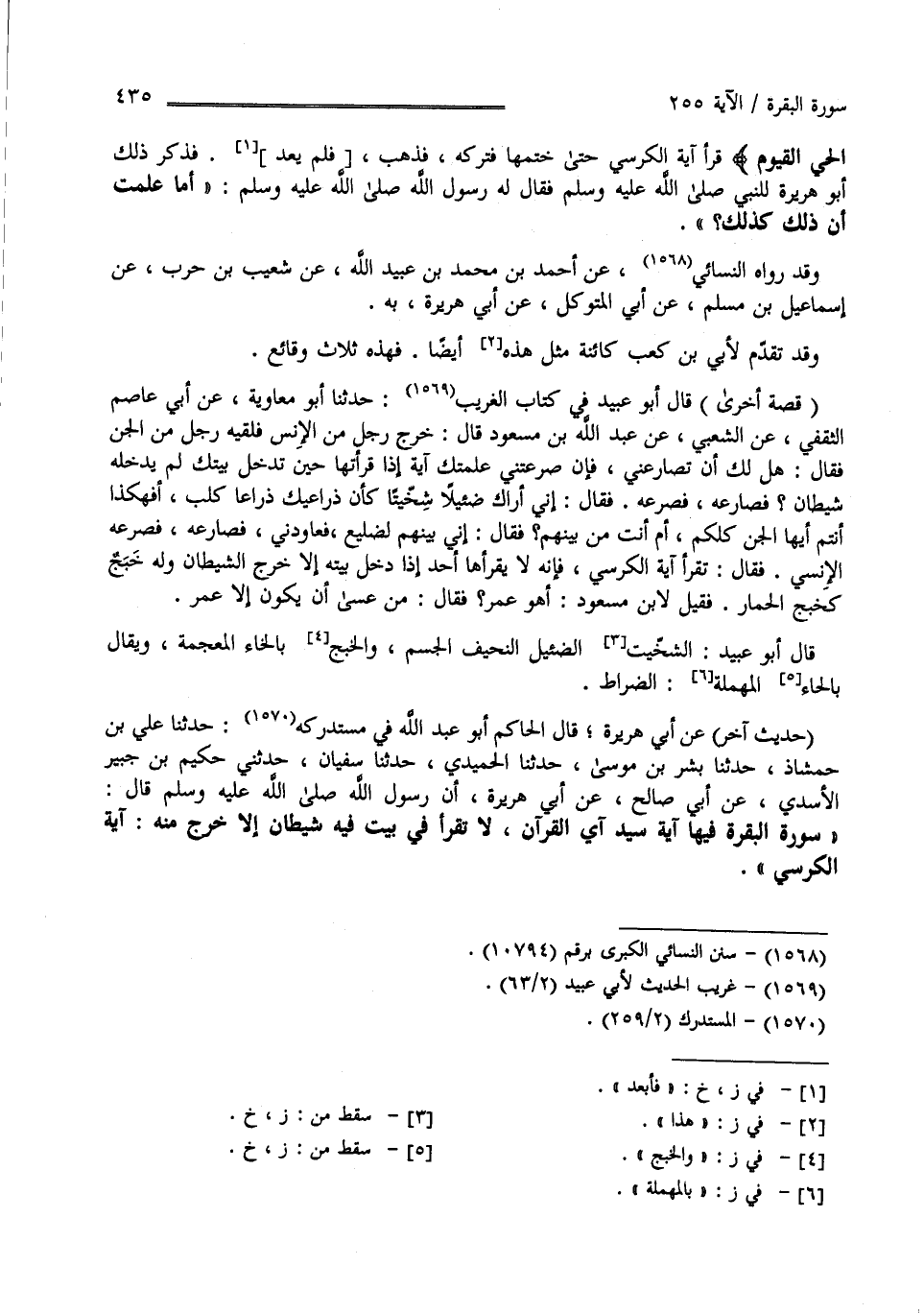 الْحَيّ الْقَيُّوم " قَرَأَ آيَة الْكُرْسِيّ حَتَّى خَتَمَهَا فَتَرَكَهُ فَذَهَبَ فَلَمْ يَعُدْ فَذَكَرَ ذَلِكَ أَبُو هُرَيْرَة لِلنَّبِيِّ - صَلَّى اللَّه عَلَيْهِ وَسَلَّمَ - فَقَالَ لَهُ رَسُول اللَّه - صَلَّى اللَّه عَلَيْهِ وَسَلَّمَ - أَمَّا عَلِمْت أَنَّ ذَلِكَ كَذَلِكَ وَقَدْ رَوَاهُ النَّسَائِيّ عَنْ أَحْمَد بْن مُحَمَّد بْن عُبَيْد اللَّه عَنْ شُعَيْب بْن حَرْب عَنْ إِسْمَاعِيل بْن مُسْلِم عَنْ أَبِي الْمُتَوَكِّل عَنْ أَبِي هُرَيْرَة بِهِ وَقَدْ تَقَدَّمَ لِأُبَيِّ بْن كَعْب كَائِنَة مِثْل هَذِهِ أَيْضًا فَهَذِهِ ثَلَاث وَقَائِع .