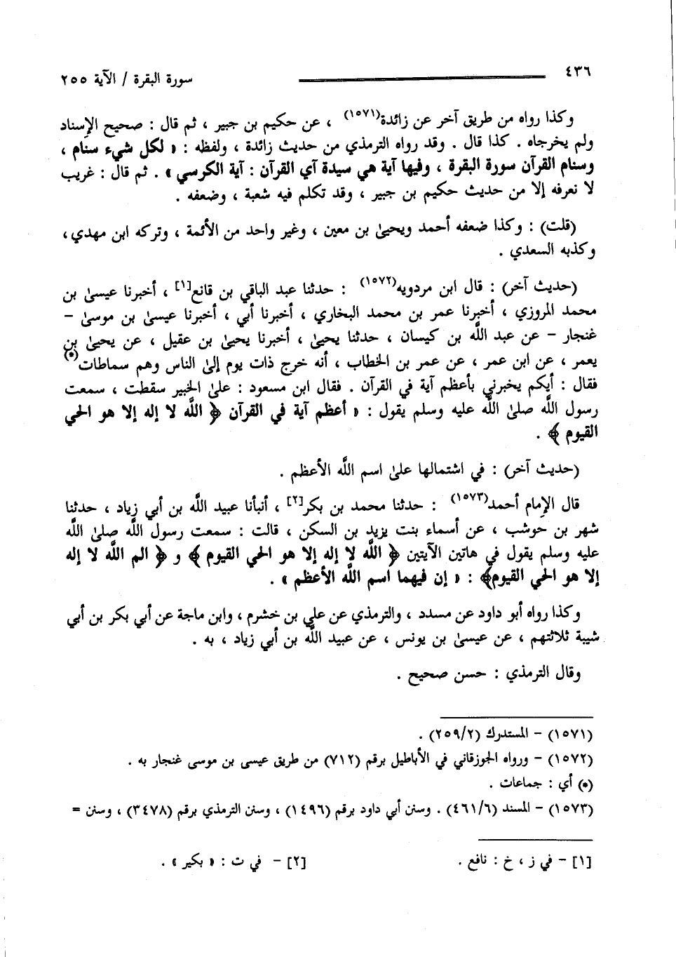 وَكَذَا رَوَاهُ مِنْ طَرِيق آخَر عَنْ زَائِدَة عَنْ حَكِيم بْن جُبَيْر ثُمَّ قَالَ : صَحِيح الْإِسْنَاد وَلَمْ يُخَرِّجَاهُ كَذَا قَالَ وَقَدْ رَوَاهُ التِّرْمِذِيّ مِنْ حَدِيث زَائِدَة وَلَفْظه لِكُلِّ شَيْء سَنَام وَسَنَام الْقُرْآن سُورَة الْبَقَرَة وَفِيهَا آيَة هِيَ سَيِّدَة آيِ الْقُرْآن : آيَة الْكُرْسِيّ ثُمَّ قَالَ : غَرِيب لَا نَعْرِفهُ إِلَّا مِنْ حَدِيث حَكِيم بْن جُبَيْر وَقَدْ تَكَلَّمَ فِيهِ شُعْبَة وَضَعَّفَهُ " قُلْت " وَكَذَا ضَعَّفَهُ أَحْمَد وَيَحْيَى بْن مَعِين وَغَيْر وَاحِد مِنْ الْأَئِمَّة وَتَرَكَهُ اِبْن مَهْدِيّ وَكَذَّبَهُ السَّعْدِيّ .