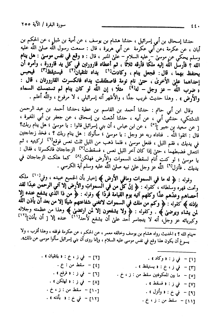قَالَ فَجَعَلَ يَنَام وَكَادَتْ يَدَاهُ تَلْتَقِيَانِ فَيَسْتَيْقِظ فَيَحْبِس إِحْدَاهُمَا عَلَى الْأُخْرَى حَتَّى نَامَ نَوْمَة فَاصْطَفَقَتْ يَدَاهُ فَانْكَسَرَتْ الْقَارُورَتَانِ قَالَ : ضَرَبَ اللَّه عَزَّ وَجَلَّ مَثَلًا أَنَّ اللَّه لَوْ كَانَ يَنَام لَمْ تَسْتَمْسِك السَّمَاء وَالْأَرْض وَهَذَا حَدِيث غَرِيب جِدًّا وَالْأَظْهَرُ أَنَّهُ إِسْرَائِيلِيٌّ لَا مَرْفُوع وَاَللَّه أَعْلَم وَقَالَ اِبْن أَبِي حَاتِم حَدَّثَنَا أَحْمَد بْن الْقَاسِم بْن عَطِيَّة حَدَّثَنَا أَحْمَد بْن عَبْد الرَّحْمَن الدَّشْتَكِيّ حَدَّثَنِي أَبِي عَنْ أَبِيهِ حَدَّثَنَا أَشْعَث بْن إِسْحَاق عَنْ جَعْفَر بْن أَبِي الْمُغِيرَة عَنْ سَعِيد بْن جُبَيْر عَنْ اِبْن عَبَّاس أَنَّ بَنِي إِسْرَائِيل قَالُوا : يَا مُوسَى هَلْ يَنَام رَبّك ؟ قَالَ اِتَّقُوا اللَّه فَنَادَاهُ رَبّه عَزَّ وَجَلَّ يَا مُوسَى سَأَلُوك هَلْ يَنَام رَبّك فَخُذْ زُجَاجَتَيْنِ فِي يَدَيْك فَقُمْ اللَّيْلَة فَفَعَلَ مُوسَى فَلَمَّا ذَهَبَ مِنْ اللَّيْل ثُلُث نَعَسَ فَوَقَعَ لِرُكْبَتَيْهِ ثُمَّ اِنْتَعَشَ فَضَبَطَهُمَا حَتَّى إِذَا كَانَ آخِر اللَّيْل نَعَسَ فَسَقَطَتْ الزُّجَاجَتَانِ فَانْكَسَرَتَا فَقَالَ يَا مُوسَى لَوْ كُنْت أَنَام لَسَقَطَتْ السَّمَوَات وَالْأَرْض فَهَلَكَتْ كَمَا هَلَكَتْ الزُّجَاجَتَانِ فِي يَدَيْك فَأَنْزَلَ اللَّه عَزَّ وَجَلَّ عَلَى نَبِيّه آيَة الْكُرْسِيّ .