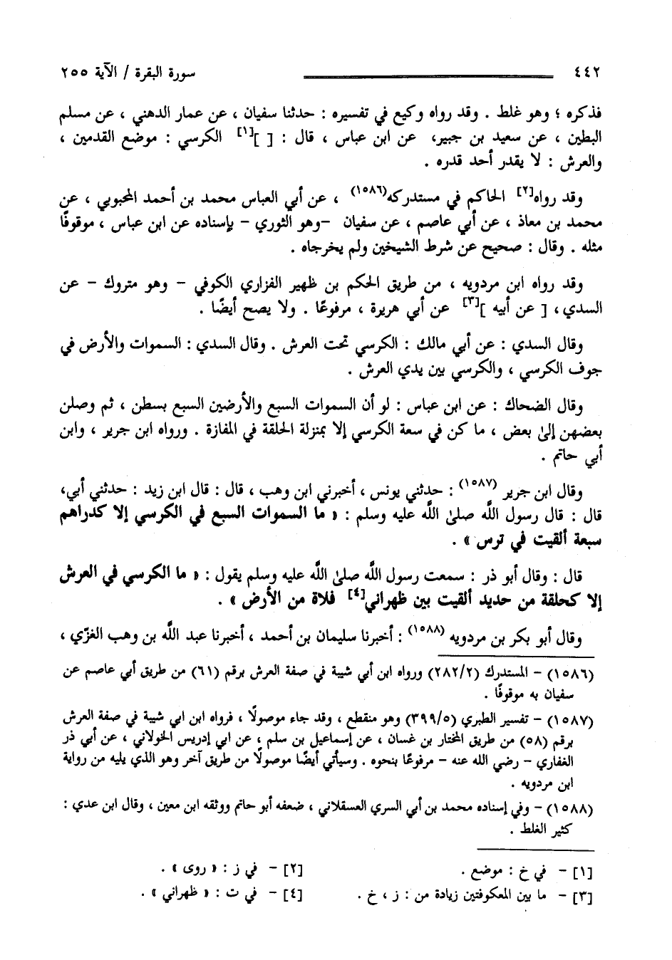 فَذَكَرَهُ وَهُوَ غَلَط وَقَدْ رَوَاهُ وَكِيع فِي تَفْسِيره حَدَّثَنَا سُفْيَان عَنْ عَمَّار الذَّهَبِيّ عَنْ مُسْلِم الْبَطِين عَنْ سَعِيد بْن جُبَيْر عَنْ اِبْن عَبَّاس قَالَ : الْكُرْسِيّ مَوْضِع الْقَدَمَيْنِ وَالْعَرْش لَا يُقَدِّر أَحَد قَدْره وَقَدْ رَوَاهُ الْحَاكِم فِي مُسْتَدْرَكه عَنْ أَبِي الْعَبَّاس بْن مُحَمَّد بْن أَحْمَد الْمَحْبُوبِيّ عَنْ مُحَمَّد بْن مُعَاذ عَنْ أَبِي عَاصِم عَنْ سُفْيَان وَهُوَ الثَّوْرِيّ بِإِسْنَادِهِ عَنْ اِبْن عَبَّاس مَوْقُوفًا مِثْله وَقَالَ : صَحِيح عَلَى شَرْط الشَّيْخَيْنِ وَلَمْ يُخَرِّجَاهُ وَقَدْ رَوَاهُ اِبْن مَرْدَوَيْهِ مِنْ طَرِيق الْحَاكِم بْن ظَهِير الْفَزَارِيّ الْكُوفِيّ وَهُوَ مَتْرُوك عَنْ السُّدِّيّ عَنْ أَبِيهِ عَنْ أَبِي هُرَيْرَة مَرْفُوعًا وَلَا يَصِحّ أَيْضًا وَقَالَ السُّدِّيّ عَنْ أَبِي مَالِك : الْكُرْسِيّ تَحْت الْعَرْش : وَقَالَ السُّدِّيّ : السَّمَوَات وَالْأَرْض فِي جَوْف الْكُرْسِيّ وَالْكُرْسِيّ بَيْن يَدَيْ الْعَرْش وَقَالَ الضَّحَّاك عَنْ اِبْن عَبَّاس : لَوْ أَنَّ السَّمَوَات السَّبْع وَالْأَرَضِينَ السَّبْع بُسِطْنَ ثُمَّ وُصِلْنَ بَعْضهنَّ إِلَى بَعْض مَا كُنَّ فِي سَعَة الْكُرْسِيّ إِلَّا بِمَنْزِلَةِ الْحَلْقَة فِي الْمَفَازَة وَرَوَاهُ اِبْن جَرِير وَابْن أَبِي حَاتِم وَقَالَ اِبْن جَرِير : حَدَّثَنِي يُونُس أَخْبَرَنِي اِبْن وَهْب قَالَ : قَالَ اِبْن زَيْد : حَدَّثَنِي أَبِي قَالَ : قَالَ رَسُول اللَّه - صَلَّى اللَّه عَلَيْهِ وَسَلَّمَ - مَا السَّمَوَات السَّبْع فِي الْكُرْسِيّ إِلَّا كَدَرَاهِم سَبْعَة أَلْقَيْت فِي تُرْس قَالَ وَقَالَ أَبُو ذَرّ : سَمِعْت رَسُول اللَّه - صَلَّى اللَّه عَلَيْهِ وَسَلَّمَ - يَقُول : مَا الْكُرْسِيّ فِي الْعَرْش إِلَّا كَحَلْقَةٍ مِنْ حَدِيد أُلْقِيَتْ بَيْن ظَهْرَانِيّ فَلَاة مِنْ الْأَرْض .