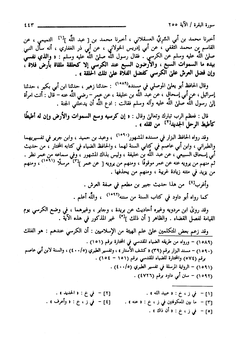 أَخْبَرَنَا مُحَمَّد بْن أَبِي الْيُسْرَى الْعَسْقَلَانِيّ أَخْبَرَنَا مُحَمَّد بْن عَبْد اللَّه التَّمِيمِيّ عَنْ الْقَاسِم بْن مُحَمَّد الثَّقَفِيّ عَنْ أَبِي إِدْرِيس الْخَوْلَانِيّ عَنْ أَبِي ذَرّ الْغِفَارِيّ أَنَّهُ سَأَلَ النَّبِيّ - صَلَّى اللَّه عَلَيْهِ وَسَلَّمَ - عَنْ الْكُرْسِيّ فَقَالَ رَسُول اللَّه - صَلَّى اللَّه عَلَيْهِ وَسَلَّمَ - وَاَلَّذِي نَفْسِي بِيَدِهِ مَا السَّمَوَات السَّبْع وَالْأَرْضُونَ السَّبْع عِنْد الْكُرْسِيّ إِلَّا كَحَلْقَةٍ مُلْقَاة بِأَرْضٍ فَلَاة وَإِنَّ فَضْل الْعَرْش عَلَى الْكُرْسِيّ كَفَضْلِ الْفَلَاة عَلَى تِلْكَ الْحَلْقَة وَقَالَ الْحَافِظ أَبُو يَعْلَى الْمَوْصِلِيّ فِي مُسْنَده حَدَّثَنَا زُهَيْر حَدَّثَنَا اِبْن أَبِي بَكْر حَدَّثَنَا إِسْرَائِيل عَنْ أَبِي إِسْحَاق عَنْ عَبْد اللَّه بْن خَلِيفَة عَنْ عُمَر - رَضِيَ اللَّه عَنْهُ - قَالَ : أَتَتْ اِمْرَأَة إِلَى رَسُول اللَّه - صَلَّى اللَّه عَلَيْهِ وَآلِهِ وَسَلَّمَ - فَقَالَتْ : اُدْعُ اللَّه أَنْ يُدْخِلنِي الْجَنَّة قَالَ فَعَظَّمَ الرَّبّ تَبَارَكَ وَتَعَالَى وَقَالَ إِنَّ كُرْسِيَّهُ وَسِعَ السَّمَوَاتِ وَالْأَرْضَ وَإِنَّ لَهُ أَطِيطًا كَأَطِيطِ الرَّحْل الْجَدِيد مِنْ ثِقَله وَقَدْ رَوَاهُ الْحَافِظ الْبَزَّار فِي مُسْنَده الْمَشْهُور وَعَبْد بْن حُمَيْد وَابْن جَرِير فِي تَفْسِيرَيْهِمَا وَالطَّبَرَانِيّ وَابْن أَبِي عَاصِم فِي كِتَابَيْ السُّنَّة لَهُمَا وَالْحَافِظ الضِّيَاء فِي كِتَاب الْمُخْتَار مِنْ حَدِيث أَبِي إِسْحَاق السَّبِيعِيّ عَنْ عَبْد اللَّه بْن خَلِيفَة وَلَيْسَ بِذَاكَ الْمَشْهُور وَفِي سَمَاعه مِنْ عُمَر نَظَر ثُمَّ مِنْهُمْ مَنْ يَرْوِيه عَنْهُ عَنْ عُمَر مَوْقُوفًا وَمِنْهُمْ مَنْ يَرْوِيه عَنْ عُمَر مُرْسَلًا وَمِنْهُمْ مَنْ يَزِيد فِي مَتْنه زِيَادَة غَرِيبَة وَمِنْهُمْ مَنْ يَحْذِفهَا وَأَغْرَبُ مِنْ هَذَا حَدِيثُ جَابِر بْن مُطْعِم فِي صِفَة الْعَرْش كَمَا رَوَاهُ أَبُو دَاوُد فِي كِتَابه السُّنَّة مِنْ سُنَنه وَاَللَّه أَعْلَم وَقَدْ رَوَى اِبْن مَرْدَوَيْهِ وَغَيْره أَحَادِيث عَنْ بُرَيْدَة وَجَابِر وَغَيْرهمَا فِي وَضْع الْكُرْسِيّ يَوْم الْقِيَامَة لِفَصْلِ الْقَضَاء وَالظَّاهِر أَنَّ ذَلِكَ غَيْر الْمَذْكُور فِي هَذِهِ الْآيَة وَقَدْ زَعَمَ بَعْض الْمُتَكَلِّمِينَ عَلَى عِلْم الْهَيْئَة مِنْ الْإِسْلَامِيِّينَ أَنَّ الْكُرْسِيّ عِنْدهمْ هُوَ الْفُلْك