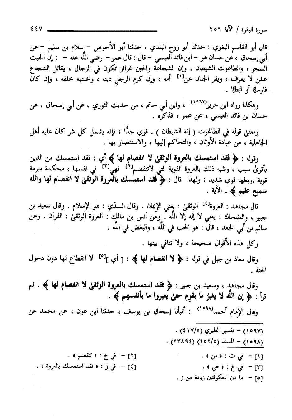 وَقَوْله " فَقَدْ اِسْتَمْسَكَ بِالْعُرْوَةِ الْوُثْقَى لَا اِنْفِصَام لَهَا " أَيْ فَقَدْ اِسْتَمْسَكَ مِنْ الدِّين بِأَقْوَى سَبَب وَشَبَّهَ ذَلِكَ بِالْعُرْوَةِ الْوُثْقَى الَّتِي لَا تَنْفَصِم هِيَ فِي نَفْسهَا مُحْكَمَة مُبْرَمَة قَوِيَّة وَرَبْطهَا قَوِيّ شَدِيد وَلِهَذَا قَالَ " فَقَدْ اِسْتَمْسَكَ بِالْعُرْوَةِ الْوُثْقَى لَا اِنْفِصَام لَهَا " الْآيَة قَالَ مُجَاهِد : الْعُرْوَة الْوُثْقَى يَعْنِي الْإِيمَان وَقَالَ السُّدِّيّ : هُوَ الْإِسْلَام وَقَالَ سَعِيد بْن جُبَيْر وَالضَّحَّاك : يَعْنِي لَا إِلَه إِلَّا اللَّه وَعَنْ أَنَس بْن مَالِك الْعُرْوَة الْوُثْقَى الْقُرْآن وَعَنْ سَالِم بْن أَبِي الْجَعْد قَالَ هُوَ الْحُبّ فِي اللَّه وَالْبُغْض فِي اللَّه وَكُلّ هَذِهِ الْأَقْوَال صَحِيحَة وَلَا تَنَافِي بَيْنهَا وَقَالَ مُعَاذ بْن جَبَل فِي قَوْله " لَا اِنْفِصَام لَهَا " دُون دُخُول الْجَنَّة وَقَالَ مُجَاهِد وَسَعِيد بْن جُبَيْر " فَقَدْ اِسْتَمْسَكَ بِالْعُرْوَةِ الْوُثْقَى لَا اِنْفِصَام لَهَا " ثُمَّ قَرَأَ " إِنَّ اللَّهَ لَا يُغَيِّرُ مَا بِقَوْمٍ حَتَّى يُغَيِّرُوا مَا بِأَنْفُسِهِمْ " وَقَالَ الْإِمَام أَحْمَد : أَنْبَأَنَا إِسْحَاق بْن يُوسُف حَدَّثَنَا اِبْن عَوْف عَنْ مُحَمَّد بْن