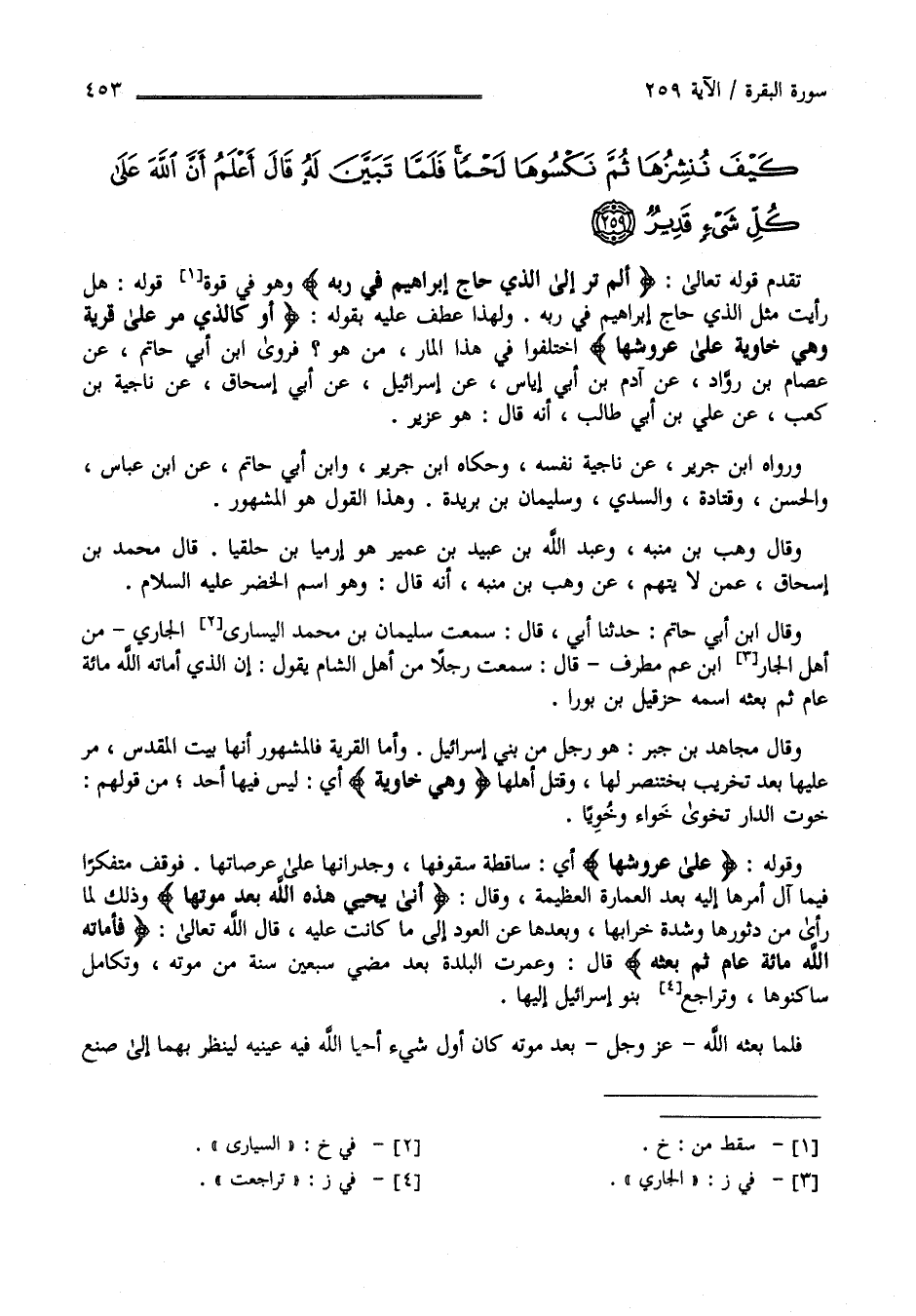 تَقَدَّمَ قَوْله تَعَالَى " أَلَمْ تَرَ إِلَى الَّذِي حَاجَّ إِبْرَاهِيم فِي رَبّه " وَهُوَ فِي قُوَّة قَوْله هَلْ رَأَيْت مِثْل الَّذِي حَاجّ إِبْرَاهِيم فِي رَبّه وَلِهَذَا عَطَفَ عَلَيْهِ بِقَوْلِهِ " أَوْ كَاَلَّذِي مَرَّ عَلَى قَرْيَة وَهِيَ خَاوِيَة عَلَى عُرُوشهَا " اِخْتَلَفُوا فِي هَذَا الْمَارّ مَنْ هُوَ فَرَوَى اِبْن أَبِي حَاتِم عَنْ عِصَام بْن دَاوُد عَنْ آدَم بْن أَبِي إِيَاس عَنْ إِسْرَائِيل عَنْ أَبِي إِسْحَاق عَنْ نَاجِيَة بْن كَعْب عَنْ عَلِيّ بْن أَبِي طَالِب أَنَّهُ قَالَ : هُوَ عُزَيْر وَرَوَاهُ اِبْن جَرِير عَنْ نَاجِيَة نَفْسه وَحَكَاهُ اِبْن جَرِير وَابْن أَبِي حَاتِم عَنْ اِبْن عَبَّاس وَالْحَسَن وَقَتَادَة وَالسُّدِّيّ وَسُلَيْمَان بْن بُرَيْدَة وَهَذَا الْقَوْل هُوَ الْمَشْهُور وَقَالَ وَهْب بْن مُنَبِّه وَعَبْد اللَّه بْن عُبَيْد هُوَ أرميا بْن حلقيا قَالَ مُحَمَّد بْن إِسْحَاق عَمَّنْ لَا يُتَّهَم عَنْ وَهْب بْن مُنَبِّه أَنَّهُ قَالَ : وَهُوَ اِسْم الْخَضِر عَلَيْهِ السَّلَام وَقَالَ اِبْن أَبِي حَاتِم : حَدَّثَنَا أَبِي قَالَ سَمِعْت سُلَيْمَان بْن مُحَمَّد الْيَسَارِيّ الْجَارِي مِنْ أَهْل الْجَارِي اِبْن عَمّ مُطَرِّف قَالَ سَمِعْت سَلْمَان يَقُول إِنَّ رَجُلًا مِنْ أَهْل الشَّام يَقُول إِنَّ الَّذِي أَمَاتَهُ اللَّه مِائَة عَام ثُمَّ بَعَثَهُ اِسْمه حِزْقِيل بْن بَوَار وَقَالَ مُجَاهِد بْن جَبْر هُوَ رَجُل مِنْ بَنِي إِسْرَائِيل وَأَمَّا الْقَرْيَة فَالْمَشْهُور أَنَّهَا بَيْت الْمَقْدِس مَرَّ عَلَيْهَا بَعْد تَخْرِيب بُخْتُنَصَّرَ لَهَا وَقَتْل أَهْلهَا " وَهِيَ خَاوِيَة " أَيْ لَيْسَ فِيهَا أَحَد مِنْ قَوْلهمْ خَوَتْ الدَّار تَخْوِي خُوِيًّا .
