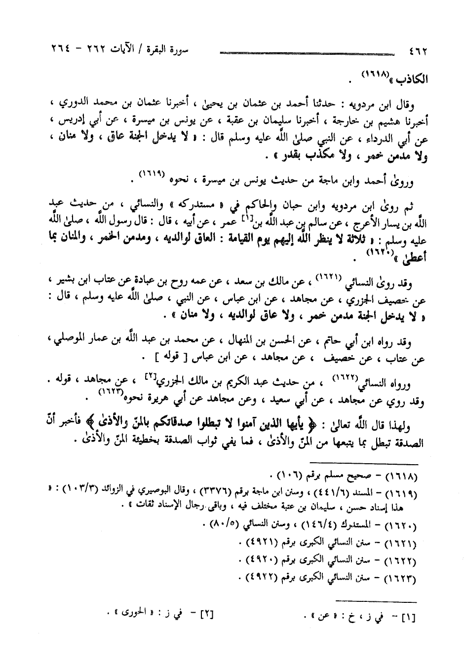 وَقَدْ رَوَى النَّسَائِيّ عَنْ مَالِك بْن سَعْد عَنْ عَمّه رَوْح بْن عُبَادَة عَنْ عَتَّاب بْن بَشِير عَنْ خُصَيْف الْجَرَارِيّ عَنْ مُجَاهِد عَنْ اِبْن عَبَّاس عَنْ النَّبِيّ - صَلَّى اللَّه عَلَيْهِ وَسَلَّمَ - قَالَ لَا يَدْخُل الْجَنَّة مُدْمِن خَمْر وَلَا عَاقّ لِوَالِدَيْهِ وَلَا مَنَّان وَقَدْ رَوَاهُ اِبْن أَبِي حَاتِم عَنْ الْحَسَن بْن الْمِنْهَال عَنْ مُحَمَّد بْن عَبْد اللَّه بْن عِصَار الْمَوْصِلِيّ عَنْ عَتَّاب عَنْ خُصَيْف عَنْ مُجَاهِد عَنْ اِبْن عَبَّاس وَرَوَاهُ النَّسَائِيّ مِنْ حَدِيث عَبْد الْكَرِيم بْن مَالِك الْحُورِيّ عَنْ مُجَاهِد قَوْله وَقَدْ رُوِيَ عَنْ مُجَاهِد عَنْ أَبِي سَعِيد وَعَنْ مُجَاهِد عَنْ أَبِي هُرَيْرَة نَحْوه وَلِهَذَا قَالَ اللَّه تَعَالَى " يَا أَيّهَا الَّذِينَ آمَنُوا لَا تُبْطِلُوا صَدَقَاتكُمْ بِالْمَنِّ وَالْأَذَى " فَأَخْبَرَ أَنَّ الصَّدَقَة تَبْطُل بِمَا يَتْبَعهَا مِنْ الْمَنّ وَالْأَذَى فَمَا بَقِيَ ثَوَاب الصَّدَقَة بِخَطِيئَةِ الْمَنّ وَالْأَذَى