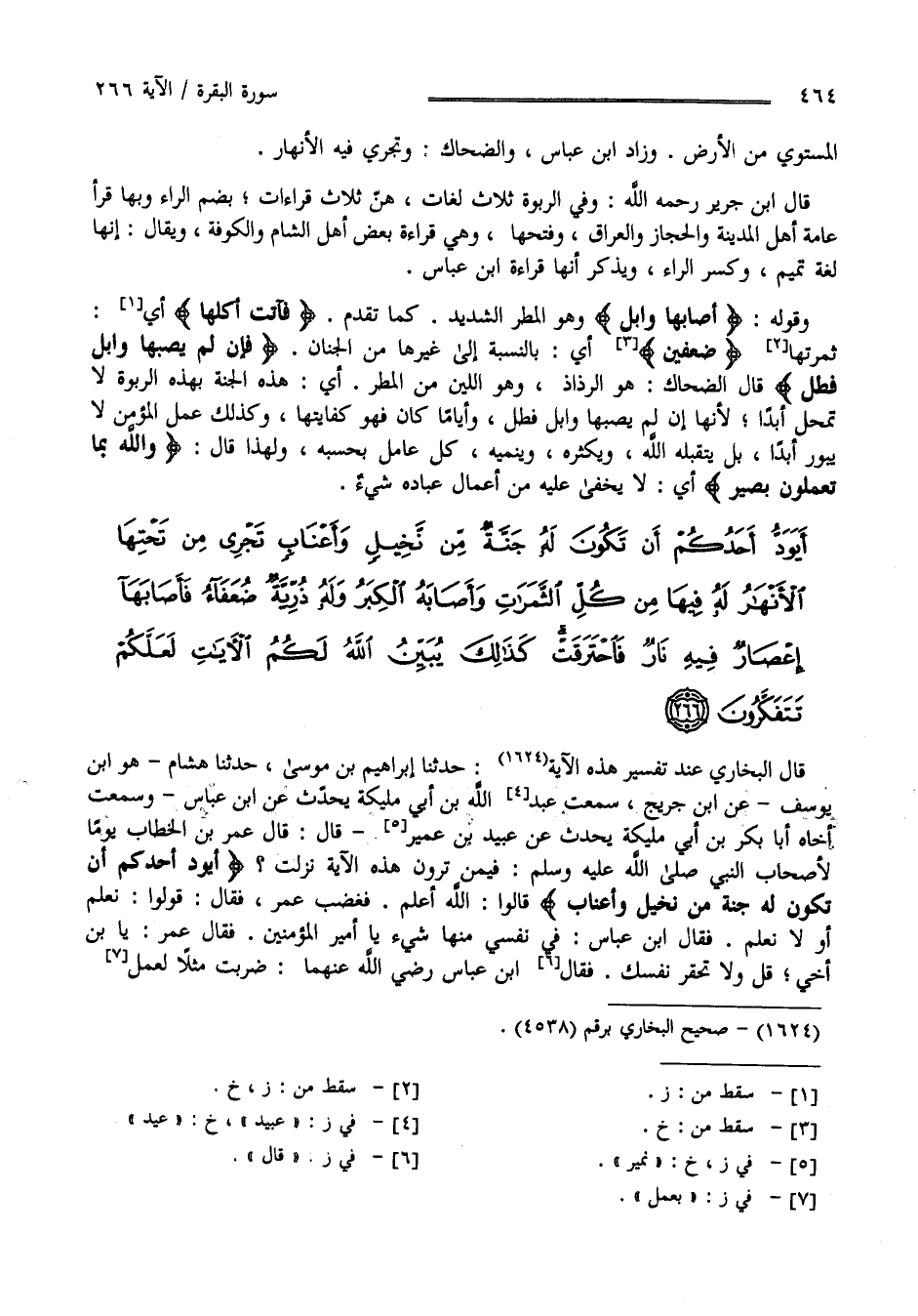قَالَ الْبُخَارِيّ عِنْد تَفْسِير هَذِهِ الْآيَة : حَدَّثَنَا إِبْرَاهِيم بْن مُوسَى حَدَّثَنَا هِشَام هُوَ اِبْن يُوسُف عَنْ اِبْن جُرَيْج سَمِعْت عَبْد اللَّه بْن أَبِي مُلَيْكَة يُحَدِّث عَنْ اِبْن عَبَّاس وَسَمِعْت أَخَاهُ أَبَا بَكْر بْن أَبِي مُلَيْكَة يُحَدِّث عَنْ عُبَيْد بْن عُمَيْر قَالَ : قَالَ عُمَر بْن الْخَطَّاب يَوْمًا لِأَصْحَابِ النَّبِيّ - صَلَّى اللَّه عَلَيْهِ وَسَلَّمَ - فِيمَنْ تَرَوْنَ هَذِهِ الْآيَة نَزَلَتْ ؟ " أَيَوَدُّ أَحَدُكُمْ أَنْ تَكُون لَهُ جَنَّة مِنْ نَخِيل وَأَعْنَاب " قَالُوا : اللَّه أَعْلَم فَغَضِبَ عُمَر فَقَالَ : قُولُوا نَعْلَم أَوْ لَا نَعْلَم فَقَالَ اِبْن عَبَّاس : فِي نَفْسِي مِنْهَا شَيْء يَا أَمِير الْمُؤْمِنِينَ فَقَالَ عُمَر : يَا اِبْن أَخِي قُلْ وَلَا تَحْقِر نَفْسك فَقَالَ اِبْن عَبَّاس رَضِيَ اللَّه عَنْهُمَا ضُرِبَتْ مَثَلًا بِعَمَلٍ