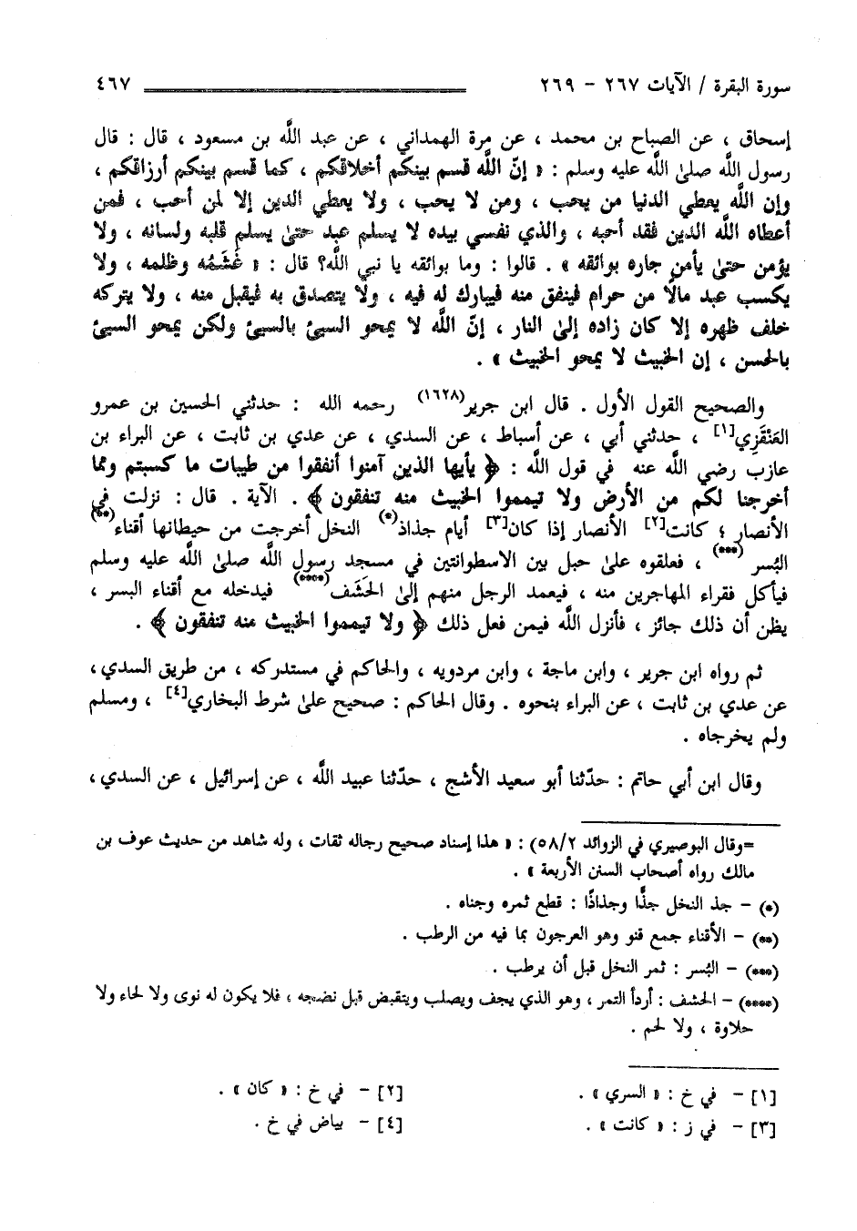 وَالصَّحِيح الْقَوْل الْأَوَّل قَالَ اِبْن جَرِير رَحِمَهُ اللَّه : حَدَّثَنَا الْحُسَيْن بْن عُمَر الْعَبْقَرِيّ حَدَّثَنِي أَبِي عَنْ أَسْبَاط عَنْ السُّدِّيّ عَنْ عَدِيّ بْن ثَابِت عَنْ الْبَرَاء بْن عَازِب - رَضِيَ اللَّه عَنْهُ - فِي قَوْل اللَّه" يَا أَيُّهَا الَّذِينَ آمَنُوا أَنْفِقُوا مِنْ طَيِّبَات مَا كَسَبْتُمْ وَمِمَّا أَخْرَجْنَا لَكُمْ مِنْ الْأَرْض وَلَا تَيَمَّمُوا الْخَبِيث مِنْهُ تُنْفِقُونَ " الْآيَة قَالَ : نَزَلَتْ فِي الْأَنْصَار كَانَتْ الْأَنْصَار إِذَا كَانَتْ أَيَّام جُذَاذ النَّخْل أَخْرَجَتْ مِنْ حِيطَانهَا الْبُسْر فَعَلَّقُوهُ عَلَى حَبْل بَيْن الْأُسْطُوَانَتَيْنِ فِي مَسْجِد رَسُول اللَّه - صَلَّى اللَّه عَلَيْهِ وَسَلَّمَ - فَيَأْكُل فُقَرَاء الْمُهَاجِرِينَ مِنْهُ فَيَعْمِد الرَّجُل مِنْهُمْ إِلَى الْحَشَف فَيُدْخِلهُ مَعَ قِنَاء الْبُسْر يَظُنّ أَنَّ ذَلِكَ جَائِز فَأَنْزَلَ اللَّه فِيمَنْ فَعَلَ ذَلِكَ " وَلَا تَيَمَّمُوا الْخَبِيث مِنْهُ تُنْفِقُونَ " ثُمَّ رَوَاهُ اِبْن جَرِير وَابْن مَاجَهْ وَابْن مَرْدَوَيْهِ وَالْحَاكِم فِي مُسْتَدْرَكه مِنْ طَرِيق السُّدِّيّ عَنْ عَدِيّ بْن ثَابِت عَنْ الْبَرَاء بِنَحْوِهِ وَقَالَ الْحَاكِم صَحِيح عَلَى شَرْط الْبُخَارِيّ وَمُسْلِم وَلَمْ يُخَرِّجَاهُ وَقَالَ اِبْن أَبِي حَاتِم : حَدَّثَنَا أَبُو سَعِيد الْأَشَجّ حَدَّثَنَا عُبَيْد اللَّه عَنْ إِسْرَائِيل عَنْ السُّدِّيّ