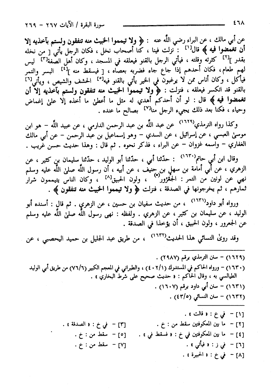 عَنْ أَبِي مَالِك عَنْ الْبَرَاء - رَضِيَ اللَّه عَنْهُ - " وَلَا تَيَمَّمُوا الْخَبِيث مِنْهُمْ تُنْفِقُونَ وَلَسْتُمْ بِآخِذِيهِ إِلَّا أَنْ تُغْمِضُوا فِيهِ " قَالَ : نَزَلَتْ فِينَا كُنَّا أَصْحَاب نَخْل فَكَانَ الرَّجُل يَأْتِي مِنْ نَخْله بِقَدْرِ كَثْرَته وَقِلَّته فَيَأْتِي الرَّجُل بِالْقِنْوِ فَيُعَلِّقهُ فِي الْمَسْجِد وَكَانَ أَهْل الصُّفَّة لَيْسَ لَهُمْ طَعَام فَكَانَ أَحَدهمْ إِذَا جَاعَ جَاءَ فَضَرَبَهُ بِعَصَاهُ فَسَقَطَ مِنْهُ الْبُسْر وَالتَّمْر فَيَأْكُل وَكَانَ أُنَاس مِنْهُ لَا يَرْغَبُونَ فِي الْخَيْر يَأْتِي بِالْقِنْوِ الْحَشَف وَالشِّيص فَيَأْتِي بِالْقِنْوِ قَدْ اِنْكَسَرَ فَيُعَلِّقهُ فَنَزَلَتْ " وَلَا تَيَمَّمُوا الْخَبِيث مِنْهُ تُنْفِقُونَ وَلَسْتُمْ بِآخِذِيهِ إِلَّا أَنْ تُغْمِضُوا فِيهِ " قَالَ لَوْ أَنَّ أَحَدكُمْ أُهْدِيَ لَهُ مِثْل مَا أَعْطَى مَا أَخَذَهُ إِلَّا عَلَى إِغْمَاض وَحَيَاء فَكُنَّا بَعْد ذَلِكَ يَجِيء الرَّجُل مِنَّا بِصَالِحِ مَا عِنْده وَكَذَا رَوَاهُ التِّرْمِذِيّ عَنْ عَبْد اللَّه بْن عَبْد الرَّحْمَن الدَّارِمِيّ عَنْ عُبَيْد اللَّه هُوَ اِبْن مُوسَى الْعَبْسِيّ عَنْ إِسْرَائِيل عَنْ السُّدِّيّ وَهُوَ إِسْمَاعِيل بْن عَبْد الرَّحْمَن عَنْ أَبِي مَالِك الْغِفَارِيّ وَاسْمه غَزْوَان عَنْ الْبَرَاء فَذَكَرَ نَحْوه ثُمَّ قَالَ وَهَذَا حَدِيث حَسَن غَرِيب وَقَالَ اِبْن أَبِي حَاتِم : حَدَّثَنَا أَبِي حَدَّثَنَا أَبُو الْوَلِيد حَدَّثَنَا سُلَيْمَان بْن كَثِير عَنْ الزُّهْرِيّ عَنْ أَبِي أُمَامَة بْن سَهْل بْن حُنَيْف عَنْ أَبِيهِ أَنَّ رَسُول اللَّه - صَلَّى اللَّه عَلَيْهِ وَسَلَّمَ - نَهَى عَنْ لَوْنَيْنِ مِنْ التَّمْر الْجُعْرُور وَالْحُبَيْق وَكَانَ النَّاس يَتَيَمَّمُونَ شِرَار ثِمَارهمْ ثُمَّ يُخْرِجُونَهَا فِي الصَّدَقَة فَنَزَلَتْ " وَلَا تَيَمَّمُوا الْخَبِيث مِنْهُ تُنْفِقُونَ " وَرَوَاهُ أَبُو دَاوُد مِنْ حَدِيث سُفْيَان بْن حُسَيْن عَنْ
