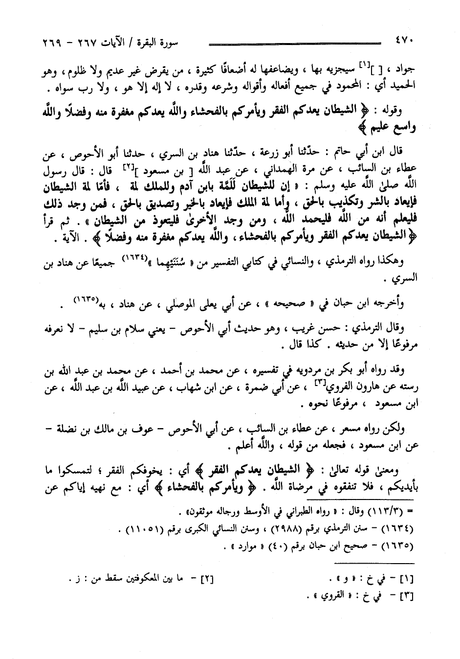 قَالَ اِبْن أَبِي حَاتِم حَدَّثَنَا أَبُو زُرْعَة حَدَّثَنَا هَنَّاد بْن السَّرِيّ حَدَّثَنَا أَبُو الْأَحْوَص عَنْ عَطَاء بْن السَّائِب عَنْ مُرَّة الْهَمْدَانِيّ عَنْ عَبْد اللَّه بْن مَسْعُود قَالَ : قَالَ رَسُول اللَّه - صَلَّى اللَّه عَلَيْهِ وَسَلَّمَ - إِنَّ لِلشَّيْطَانِ لَمَّة بِابْنِ آدَم وَلِلْمَلَكِ لَمَّة فَأَمَّا لَمَّة الشَّيْطَان فَإِيعَادٌ بِالشَّرِّ وَتَكْذِيب بِالْحَقِّ وَأَمَّا لَمَّة الْمَلَك فَإِيعَاد بِالْخَيْرِ وَتَصْدِيق بِالْحَقِّ فَمَنْ وَجَدَ ذَلِكَ فَلْيَعْلَمْ أَنَّهُ مِنْ اللَّه فَلْيَحْمَدْ اللَّه وَمَنْ وَجَدَ الْأُخْرَى فَلْيَتَعَوَّذْ مِنْ الشَّيْطَان ثُمَّ قَرَأَ " الشَّيْطَانُ يَعِدُكُمْ الْفَقْرَ وَيَأْمُرُكُمْ بِالْفَحْشَاءِ وَاَللَّه يَعِدُكُمْ مَغْفِرَة مِنْهُ وَفَضْلًا " الْآيَة وَهَكَذَا رَوَاهُ التِّرْمِذِيّ وَالنَّسَائِيّ فِي كِتَابَيْ التَّفْسِير مِنْ سُنَنهمَا جَمِيعًا عَنْ هَنَّاد بْن السَّرِيّ وَأَخْرَجَهُ اِبْن حِبَّان فِي صَحِيحه عَنْ أَبِي يَعْلَى الْمَوْصِلِيّ عَنْ هَنَّاد بِهِ وَقَالَ التِّرْمِذِيّ : حَسَن غَرِيب وَهُوَ حَدِيث أَبِي الْأَحْوَص يَعْنِي سَلَّام بْن سُلَيْم لَا نَعْرِفهُ مَرْفُوعًا إِلَّا مِنْ حَدِيثه كَذَا قَالَ : وَقَدْ رَوَاهُ أَبُو بَكْر بْن مَرْدَوَيْهِ فِي تَفْسِيره عَنْ مُحَمَّد بْن أَحْمَد عَنْ مُحَمَّد بْن عَبْد اللَّه بْن مَسْعُود مَرْفُوعًا نَحْوه وَلَكِنْ رَوَاهُ مِسْعَر عَنْ عَطَاء بْن السَّائِب عَنْ أَبِي الْأَحْوَص عَوْف بْن مَالِك بْن نَضْلَة عَنْ اِبْن مَسْعُود فَجَعَلَهُ مِنْ قَوْله وَاَللَّه أَعْلَم وَمَعْنَى قَوْله تَعَالَى" الشَّيْطَان يَعِدكُمْ " أَيْ يُخَوِّفكُمْ الْفَقْر لِتُمْسِكُوا مَا بِأَيْدِيكُمْ فَلَا تُنْفِقُوهُ فِي مَرْضَاة اللَّه " وَيَأْمُركُمْ بِالْفَحْشَاءِ " أَيْ مَعَ نَهْيه إِيَّاكُمْ عَنْ