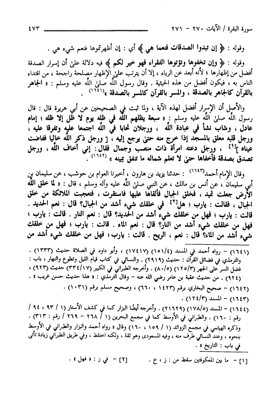 وَقَوْله " وَإِنْ تُخْفُوهَا وَتُؤْتُوهَا الْفُقَرَاء فَهُوَ خَيْر لَكُمْ " فِيهِ دَلَالَة عَلَى أَنَّ إِسْرَار الصَّدَقَة أَفْضَل مِنْ إِظْهَارهَا لِأَنَّهُ أَبْعَد عَنْ الرِّيَاء إِلَّا أَنْ يَتَرَتَّب عَلَى الْإِظْهَار مَصْلَحَة رَاجِحَة مِنْ اِقْتِدَاء النَّاس بِهِ فَيَكُون أَفْضَل مِنْ هَذِهِ الْحَيْثِيَّة وَقَالَ رَسُول اللَّه صَلَّى اللَّه عَلَيْهِ وَسَلَّمَ الْجَاهِرُ بِالْقُرْآنِ كَالْجَاهِرِ بِالصَّدَقَةِ وَالْمُسِرُّ بِالْقُرْآنِ كَالْمُسِرِّ بِالصَّدَقَةِ وَالْأَصْل أَنَّ الْإِسْرَار أَفْضَل لِهَذِهِ الْآيَة وَلِمَا ثَبَتَ فِي الصَّحِيحَيْنِ عَنْ أَبِي هُرَيْرَة قَالَ : قَالَ رَسُول اللَّه - صَلَّى اللَّه عَلَيْهِ وَسَلَّمَ - سَبْعَة يُظِلُّهُمْ اللَّهُ فِي ظِلِّهِ يَوْم لَا ظِلَّ إِلَّا ظِلُّهُ : إِمَامٌ عَادِلٌ وَشَابٌّ نَشَأَ فِي عِبَادَةِ اللَّهِ وَرَجُلَانِ تَحَابَّا فِي اللَّهِ اِجْتَمَعَا عَلَيْهِ وَتَفَرَّقَا عَلَيْهِ وَرَجُلٌ قَلْبُهُ مُعَلَّقٌ بِالْمَسْجِدِ إِذَا خَرَجَ مِنْهُ حَتَّى يَرْجِعَ إِلَيْهِ وَرَجُلٌ ذَكَرَ اللَّهَ خَالِيًا فَفَاضَتْ عَيْنَاهُ وَرَجُلٌ دَعَتْهُ اِمْرَأَةٌ ذَاتُ مَنْصِبٍ وَجَمَالٍ فَقَالَ إِنِّي أَخَافُ اللَّهَ رَبّ الْعَالَمِينَ وَرَجُلٌ تَصَدَّقَ بِصَدَقَةٍ فَأَخْفَاهَا حَتَّى لَا تَعْلَم شِمَاله مَا تُنْفِق يَمِينه وَقَالَ الْإِمَام أَحْمَد : حَدَّثَنَا يَزِيد بْن هَارُون أَخْبَرَنَا الْعَوَّام بْن حَوْشَب عَنْ سُلَيْمَان بْن أَبِي سُلَيْمَان عَنْ أَنَس بْن مَالِك عَنْ النَّبِيّ - صَلَّى اللَّه تَعَالَى عَلَيْهِ وَعَلَى آلِهِ وَسَلَّمَ - قَالَ لَمَّا خَلَقَ اللَّه الْأَرْض جَعَلَتْ تَمِيد فَخَلَقَ الْجِبَال فَأَلْقَاهَا عَلَيْهَا فَاسْتَقَرَّتْ فَتَعَجَّبَتْ الْمَلَائِكَة مِنْ خَلْق الْجِبَال فَقَالَتْ : يَا رَبّ هَلْ فِي خَلْقك شَيْء أَشَدّ مِنْ الْجِبَال ؟ قَالَ نَعَمْ الْحَدِيد قَالَتْ : يَا رَبّ فَهَلْ مِنْ خَلْقك شَيْء أَشَدّ مِنْ الْحَدِيد قَالَ : نَعَمْ النَّار قَالَتْ : يَا رَبّ فَهَلْ مِنْ خَلْقك شَيْء أَشَدّ مِنْ النَّار ؟ قَالَ : نَعَمْ الْمَاء قَالَتْ : يَا رَبّ فَهَلْ مِنْ خَلْقك شَيْء أَشَدّ مِنْ الْمَاء ؟ قَالَ : نَعَمْ