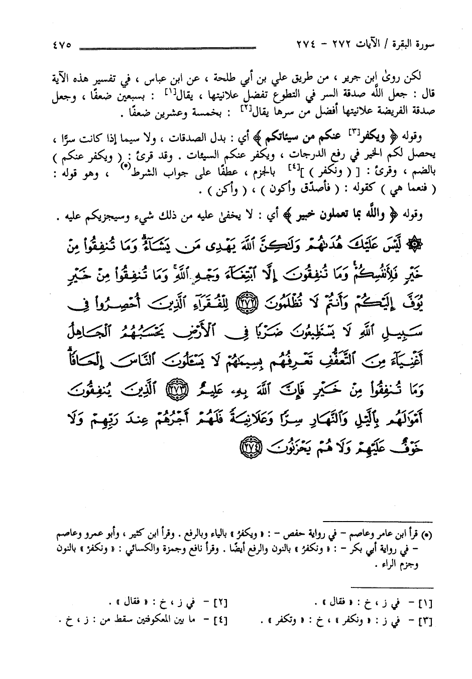 لَكِنْ رَوَى اِبْن جَرِير مِنْ طَرِيق عَلِيّ بْن أَبِي طَلْحَة عَنْ اِبْن عَبَّاس فِي تَفْسِير هَذِهِ الْآيَة قَالَ : جَعَلَ اللَّه صَدَقَة السِّرّ فِي التَّطَوُّع تَفْضُل عَلَانِيَتهَا يُقَال بِسَبْعِينَ ضِعْفًا وَجَعَلَ صَدَقَة الْفَرِيضَة عَلَانِيَتهَا أَفْضَل مِنْ سِرّهَا يُقَال بِخَمْسَةٍ وَعِشْرِينَ ضِعْفًا.