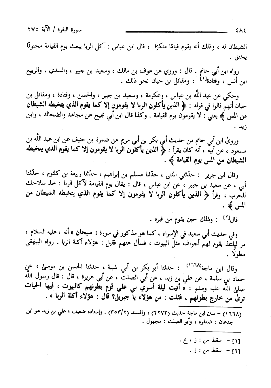 الشَّيْطَان لَهُ وَذَلِكَ أَنَّهُ يَقُوم قِيَامًا مُنْكَرًا وَقَالَ اِبْن عَبَّاس : آكِل الرِّبَا يُبْعَث يَوْم الْقِيَامَة مَجْنُونًا يُخْنَق رَوَاهُ اِبْن أَبِي حَاتِم قَالَ وَرُوِيَ عَنْ عَوْف بْن مَالِك وَسَعِيد بْن جُبَيْر وَالسُّدِّيّ وَالرَّبِيع بْن أَنَس وَقَتَادَة وَمُقَاتِل بْن حَيَّان نَحْو ذَلِكَ وَحُكِيَ عَنْ عَبْد اللَّه بْن عَبَّاس وَعِكْرِمَة وَسَعِيد بْن جُبَيْر وَالْحَسَن وَقَتَادَة وَمُقَاتِل بْن حَيَّان أَنَّهُمْ قَالُوا : فِي قَوْله " الَّذِينَ يَأْكُلُونَ الرِّبَا لَا يَقُومُونَ إِلَّا كَمَا يَقُوم الَّذِي يَتَخَبَّطهُ الشَّيْطَان مِنْ الْمَسّ " يَعْنِي لَا يَقُومُونَ يَوْم الْقِيَامَة وَكَذَا قَالَ اِبْن أَبِي نَجِيح عَنْ مُجَاهِد وَالضَّحَّاك وَابْن زَيْد وَرَوَى اِبْن أَبِي حَاتِم مِنْ حَدِيث أَبِي بَكْر بْن أَبِي مَرْيَم عَنْ ضَمْرَة بْن حُنَيْف عَنْ أَبِي عَبْد اللَّه بْن مَسْعُود عَنْ أَبِيهِ أَنَّهُ كَانَ يَقْرَأ : " الَّذِينَ يَأْكُلُونَ الرِّبَا لَا يَقُومُونَ إِلَّا كَمَا يَقُوم الَّذِي يَتَخَبَّطهُ الشَّيْطَان مِنْ الْمَسّ يَوْم الْقِيَامَة " وَقَالَ اِبْن جَرِير : حَدَّثَنِي الْمُثَنَّى حَدَّثَنَا مُسْلِم بْن إِبْرَاهِيم حَدَّثَنَا رَبِيعَة بْن كُلْثُوم حَدَّثَنَا أَبِي عَنْ سَعِيد بْن جُبَيْر عَنْ اِبْن عَبَّاس قَالَ يُقَال يَوْم الْقِيَامَة لِآكِلِ الرِّبَا خُذْ سِلَاحك لِلْحَرْبِ وَقَرَأَ " الَّذِينَ يَأْكُلُونَ الرِّبَا لَا يَقُومُونَ إِلَّا كَمَا يَقُوم الَّذِي يَتَخَبَّطهُ الشَّيْطَان مِنْ الْمَسّ " وَذَلِكَ حِين يَقُوم مِنْ قَبْره وَفِي حَدِيث أَبِي سَعِيد فِي الْإِسْرَاء كَمَا هُوَ مَذْكُور فِي سُورَة سُبْحَان أَنَّهُ عَلَيْهِ السَّلَام مَرَّ لَيْلَتئِذٍ بِقَوْمٍ لَهُمْ أَجْوَاف مِثْل الْبُيُوت فَسَأَلَ عَنْهُمْ فَقِيلَ : هَؤُلَاءِ أَكَلَة الرِّبَا رَوَاهُ الْبَيْهَقِيّ مُطَوَّلًا وَقَالَ اِبْن أَبِي حَاتِم حَدَّثَنَا أَبُو بَكْر بْن أَبِي شَيْبَة حَدَّثَنَا الْحَسَن بْن مُوسَى عَنْ حَمَّاد بْن سَلَمَة عَنْ عَلِيّ بْن زَيْد عَنْ أَبِي الصَّلْت عَنْ أَبِي هُرَيْرَة قَالَ : قَالَ رَسُول اللَّه - صَلَّى اللَّه عَلَيْهِ وَسَلَّمَ - أَتَيْت لَيْلَة أُسْرِيَ بِي عَلَى قَوْم بُطُونهمْ كَالْبُيُوتِ فِيهَا الْحَيَّات تَجْرِي مِنْ خَارِج بُطُونهمْ فَقُلْت : مَنْ هَؤُلَاءِ يَا جِبْرِيل ؟ قَالَ : هَؤُلَاءِ أَكَلَة الرِّبَا
