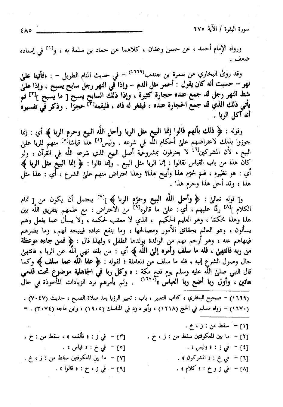 وَقَوْله " ذَلِكَ بِأَنَّهُمْ قَالُوا إِنَّمَا الْبَيْعُ مِثْل الرِّبَا وَأَحَلَّ اللَّه الْبَيْع وَحَرَّمَ الرِّبَا" أَيْ إِنَّمَا جُوزُوا بِذَلِكَ لِاعْتِرَاضِهِمْ عَلَى أَحْكَام اللَّه فِي شَرْعه وَلَيْسَ هَذَا قِيَاسًا مِنْهُمْ لِلرِّبَا عَلَى الْبَيْع لِأَنَّ الْمُشْرِكِينَ لَا يَعْتَرِفُونَ بِمَشْرُوعِيَّةِ أَصْل الْبَيْع الَّذِي شَرَعَهُ اللَّه فِي الْقُرْآن وَلَوْ كَانَ هَذَا مِنْ بَاب الْقِيَاس لَقَالُوا : إِنَّمَا الرِّبَا مِثْل الْبَيْع وَإِنَّمَا قَالُوا " إِنَّمَا الْبَيْع مِثْل الرِّبَا " أَيْ هُوَ نَظِيره فَلِمَ حُرِّمَ هَذَا وَأُبِيحَ هَذَا ؟ وَهَذَا اِعْتِرَاض مِنْهُمْ عَلَى الشَّرْع أَيْ هَذَا مِثْل هَذَا وَقَدْ أَحَلَّ هَذَا وَحَرَّمَ هَذَا يَحْتَمِل أَنْ يَكُون مِنْ تَمَام الْكَلَام رَدًّا عَلَيْهِمْ أَيْ عَلَى مَا قَالُوهُ مِنْ الِاعْتِرَاض مَعَ عِلْمهمْ بِتَفْرِيقِ اللَّه بَيْن هَذَا وَهَذَا حُكْمًا وَهُوَ الْعَلِيم الْحَكِيم الَّذِي لَا مُعَقِّب لِحُكْمِهِ وَلَا يُسْأَل عَمَّا يَفْعَل وَهُمْ يُسْأَلُونَ وَهُوَ الْعَالِم بِحَقَائِق الْأُمُور وَمَصَالِحهَا وَمَا يَنْفَع عِبَاده فَيُبِيحهُ لَهُمْ وَمَا يَضُرّهُمْ فَيَنْهَاهُمْ عَنْهُ وَهُوَ أَرْحَم بِهِمْ مِنْ الْوَالِدَة بِوَلَدِهَا الطِّفْل وَلِهَذَا قَالَ" فَمَنْ جَاءَهُ مَوْعِظَة مِنْ رَبّه فَانْتَهَى فَلَهُ مَا سَلَفَ وَأَمْرُهُ إِلَى اللَّه " أَيْ مَنْ بَلَغَهُ نَهْيُ اللَّه عَنْ الرِّبَا فَانْتَهَى حَال وُصُول الشَّرْع إِلَيْهِ فَلَهُ مَا سَلَفَ مِنْ الْمُعَامَلَة لِقَوْلِهِ " عَفَا اللَّه عَمَّا سَلَفَ " وَكَمَا قَالَ النَّبِيّ - صَلَّى اللَّه عَلَيْهِ وَسَلَّمَ - يَوْم فَتْح مَكَّة وَكُلّ رِبًا فِي الْجَاهِلِيَّة مَوْضُوعٌ تَحْت قَدَمَيَّ هَاتَيْنِ وَأَوَّل رِبًا أَضَع رِبَا الْعَبَّاس وَلَمْ يَأْمُرهُمْ بِرَدِّ الزِّيَادَات الْمَأْخُوذَة فِي حَال