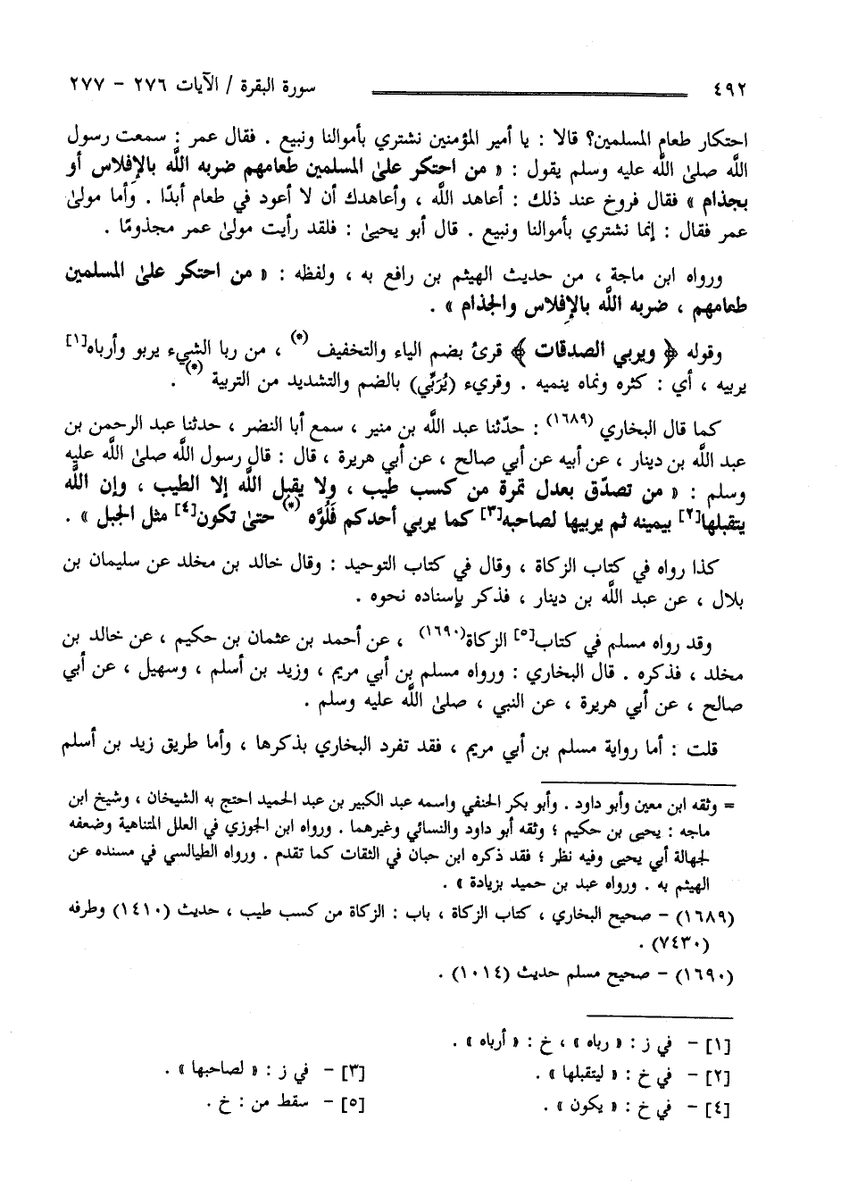 وَقَوْله " وَيُرْبِي الصَّدَقَات " قُرِئَ بِضَمِّ الْيَاء وَالتَّخْفِيف مِنْ رَبَا الشَّيْء يَرْبُو وَأَرْبَاهُ يُرْبِيه أَيْ كَثَّرَهُ وَنَمَّاهُ يُنَمِّيه وَقُرِئَ يُرَبِّي بِالضَّمِّ وَالتَّشْدِيد مِنْ التَّرْبِيَة قَالَ الْبُخَارِيّ حَدَّثَنَا عَبْد اللَّه بْن كَثِير أَخْبَرَنَا كَثِير سَمِعَ أَبَا النَّضْر حَدَّثَنَا عَبْد الرَّحْمَن بْن عَبْد اللَّه بْن دِينَار عَنْ أَبِيهِ عَنْ أَبِي صَالِح عَنْ أَبِي هُرَيْرَة قَالَ : قَالَ رَسُول اللَّه - صَلَّى اللَّه عَلَيْهِ وَسَلَّمَ - مَنْ تَصَدَّقَ بِعِدْلِ تَمْرَة مِنْ كَسْب طَيِّب وَلَا يَقْبَل اللَّه إِلَّا الطَّيِّب فَإِنَّ اللَّه يَتَقَبَّلهَا بِيَمِينِهِ ثُمَّ يُرَبِّيهَا لِصَاحِبِهَا كَمَا يُرَبِّي أَحَدكُمْ فَلُوَّهُ حَتَّى يَكُون مِثْل الْجَبَل كَذَا رَوَاهُ فِي كِتَاب الزَّكَاة وَقَالَ فِي كِتَاب التَّوْحِيد وَقَالَ خَالِد بْن مَخْلَد بْن سُلَيْمَان بْن بِلَال عَنْ عَبْد اللَّه بْن دِينَار فَذَكَرَ بِإِسْنَادِهِ نَحْوه وَقَدْ رَوَاهُ مُسْلِم فِي الزَّكَاة عَنْ أَحْمَد بْن عُثْمَان بْن حَكِيم عَنْ خَالِد بْن مَخْلَد فَذَكَرَهُ وَقَالَ الْبُخَارِيّ : وَرَوَاهُ مُسْلِم بْن أَبِي مَرْيَم وَزَيْد بْن أَسْلَمَ وَسُهَيْل عَنْ أَبِي صَالِح عَنْ أَبِي هُرَيْرَة عَنْ النَّبِيّ - صَلَّى اللَّه عَلَيْهِ وَسَلَّمَ - قُلْت أَمَّا رِوَايَة مُسْلِم بْن أَبِي مَرْيَم فَقَدْ تَفَرَّدَ الْبُخَارِيّ بِذِكْرِهَا وَأَمَّا طَرِيق زَيْد بْن أَسْلَمَ