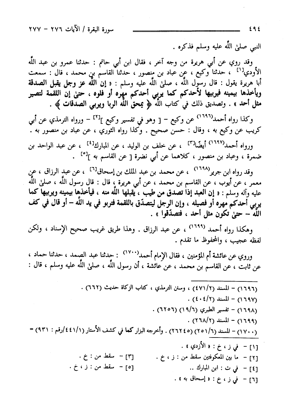 رَسُول اللَّه - صَلَّى اللَّه عَلَيْهِ وَسَلَّمَ - إِنَّ اللَّه عَزَّ وَجَلَّ يَقْبَل الصَّدَقَة وَيَأْخُذهَا بِيَمِينِهِ فَيُرَبِّيهَا لِأَحَدِكُمْ كَمَا يُرَبِّي أَحَدكُمْ مُهْره أَوْ فَلُوّهُ حَتَّى إِنَّ اللُّقْمَة لِتَصِيرَ مِثْل أُحُد وَتَصْدِيق ذَلِكَ فِي كِتَاب اللَّه " يَمْحَق اللَّه الرِّبَا وَيُرْبِي الصَّدَقَات " وَكَذَا رَوَاهُ أَحْمَد عَنْ وَكِيع وَهُوَ فِي تَفْسِير وَكِيع وَرَوَاهُ التِّرْمِذِيّ عَنْ أَبِي كُرَيْب عَنْ وَكِيع بِهِ وَقَالَ حَسَن صَحِيح وَكَذَا رَوَاهُ التِّرْمِذِيّ عَنْ عَبَّاد بْن مَنْصُور بِهِ وَرَوَاهُ أَحْمَد أَيْضًا عَنْ خَلَف بْن الْوَلِيد عَنْ اِبْن الْمُبَارَك عَنْ عَبْد الْوَاحِد بْن ضَمْرَة وَعَبَّاد بْن مَنْصُور كِلَاهُمَا عَنْ أَبِي نَضْرَة عَنْ الْقَاسِم بِهِ وَقَدْ رَوَاهُ اِبْن جَرِير عَنْ مُحَمَّد بْن عَبْد الْمَلِك بْن إِسْحَاق عَنْ عَبْد الرَّزَّاق عَنْ مَعْمَر عَنْ أَيُّوب عَنْ الْقَاسِم بْن مُحَمَّد عَنْ أَبِي هُرَيْرَة قَالَ : قَالَ رَسُول اللَّه - صَلَّى اللَّه عَلَيْهِ وَآلِهِ وَسَلَّمَ - إِنَّ الْعَبْد إِذَا تَصَدَّقَ مِنْ طَيِّب يَقْبَلهَا اللَّه مِنْهُ فَيَأْخُذهَا بِيَمِينِهِ وَيُرَبِّيهَا كَمَا يُرَبِّي أَحَدكُمْ مُهْره أَوْ فَصِيله وَإِنَّ الرَّجُل لِيَتَصَدَّق بِاللُّقْمَةِ فَتَرْبُو فِي يَد اللَّه أَوْ قَالَ فِي كَفّ اللَّه حَتَّى تَكُون مِثْل أُحُد فَتَصَدَّقُوا وَهَكَذَا رَوَاهُ أَحْمَد عَنْ عَبْد الرَّزَّاق وَهَذَا طَرِيق غَرِيب صَحِيح الْإِسْنَاد وَلَكِنَّ لَفْظه عَجِيب وَالْمَحْفُوظ مَا تَقَدَّمَ وَرُوِيَ عَنْ عَائِشَة أُمّ الْمُؤْمِنِينَ فَقَالَ الْإِمَام أَحْمَد حَدَّثَنَا عَبْد الصَّمَد حَدَّثَنَا حَمَّاد عَنْ ثَابِت عَنْ الْقَاسِم بْن مُحَمَّد عَنْ عَائِشَة أَنَّ رَسُول اللَّه - صَلَّى اللَّه عَلَيْهِ وَسَلَّمَ - قَالَ