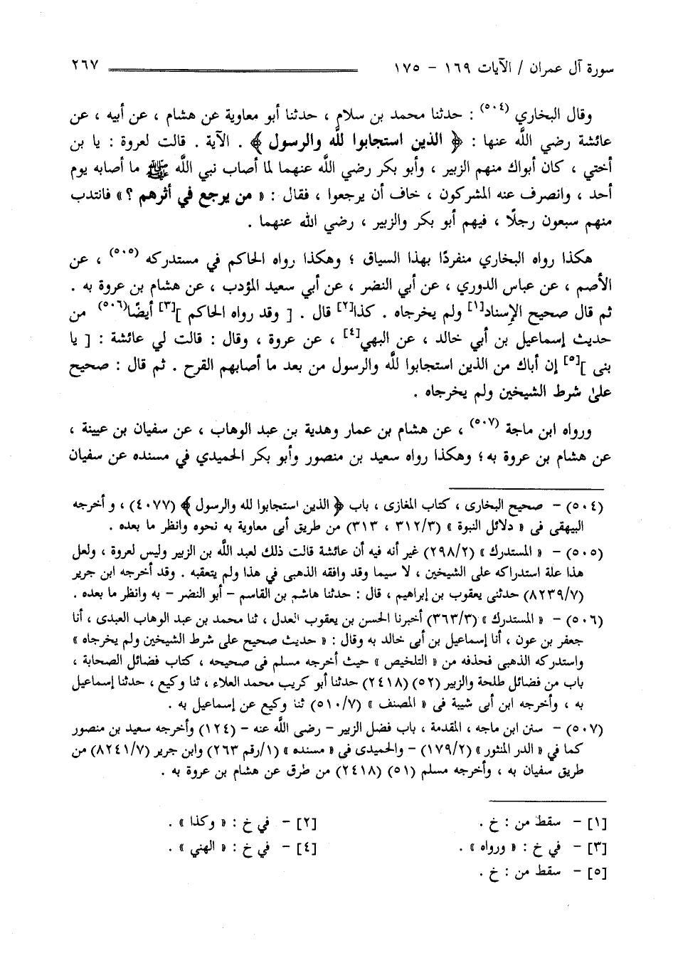 قُلْت لِعُرْوَةَ : يَا اِبْن أُخْتِي كَانَ أَبُوك مِنْهُمْ الزُّبَيْر وَأَبُو بَكْر رَضِيَ اللَّه عَنْهُمَا لَمَّا أَصَابَ نَبِيّ اللَّه صَلَّى اللَّه عَلَيْهِ وَسَلَّمَ مَا أَصَابَهُ يَوْم أُحُد وَانْصَرَفَ عَنْهُ الْمُشْرِكُونَ خَافَ أَنْ يَرْجِعُوا فَقَالَ " مَنْ يَرْجِع فِي أَثَرهمْ " فَانْتَدَبَ مِنْهُمْ سَبْعُونَ رَجُلًا فِيهِمْ أَبُو بَكْر وَالزُّبَيْر هَكَذَا رَوَاهُ الْبُخَارِيّ مُنْفَرِدًا بِهِ بِهَذَا السِّيَاق وَهَكَذَا رَوَاهُ الْحَاكِم فِي مُسْتَدْرَكه عَنْ الْأَصَمّ عَنْ أَبِي الْعَبَّاس الدُّورِيّ عَنْ أَبِي النَّضْر عَنْ أَبَى سَعِيد الْمُؤَدِّب عَنْ هِشَام بْن عُرْوَة بِهِ : ثُمَّ قَالَ صَحِيح الْإِسْنَاد وَلَمْ يُخَرِّجَاهُ كَذَا قَالَ : وَرَوَاهُ اِبْن مَاجَهْ عَنْ هِشَام بْن عَمَّار وَهُدْبَة بْن عَبْد الْوَهَّاب عَنْ سُفْيَان بْن عُيَيْنَةَ عَنْ هِشَام بْن عُرْوَة بِهِ وَهَكَذَا رَوَاهُ سَعِيد بْن مَنْصُور وَأَبُو بَكْر الْحُمَيْدِيّ فِي مُسْنَده عَنْ سُفْيَان